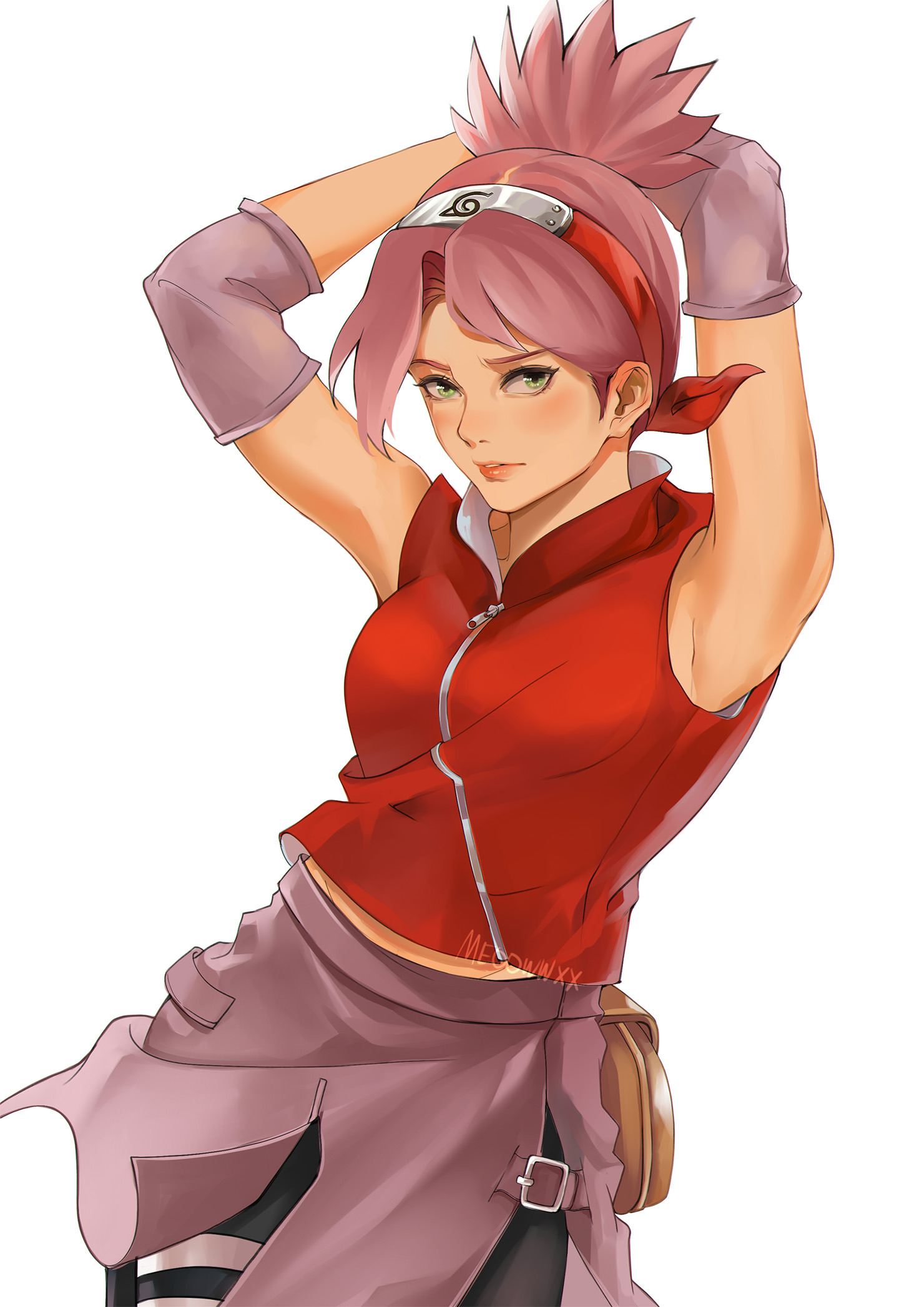 armband armpits arms_up bare_shoulders clothes_around_waist commentary english_commentary green_eyes hairband haruno_sakura highres looking_at_viewer meoowwxx naruto_(classic) naruto_(series) naruto_shippuuden parted_lips pink_armband pink_hair red_shirt shirt simple_background sleeveless sleeveless_shirt white_background