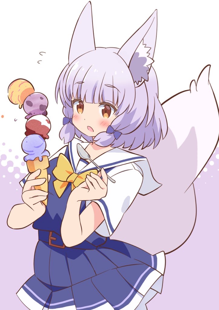 1girl :o animal_ear_fluff animal_ears blue_shirt blue_skirt blush bow brown_eyes commentary_request cowboy_shot flying_sweatdrops food fox_ears fox_girl fox_tail from_side hands_up holding holding_food holding_ice_cream holding_spoon ice_cream ice_cream_cone machikado_mazoku miniskirt multiple_scoops open_mouth pleated_skirt pon_sugar riko_(machikado_mazoku) sailor_collar school_uniform serafuku shirt skirt solo spoon standing tail tail_raised too_many too_many_scoops white_sailor_collar yellow_bow