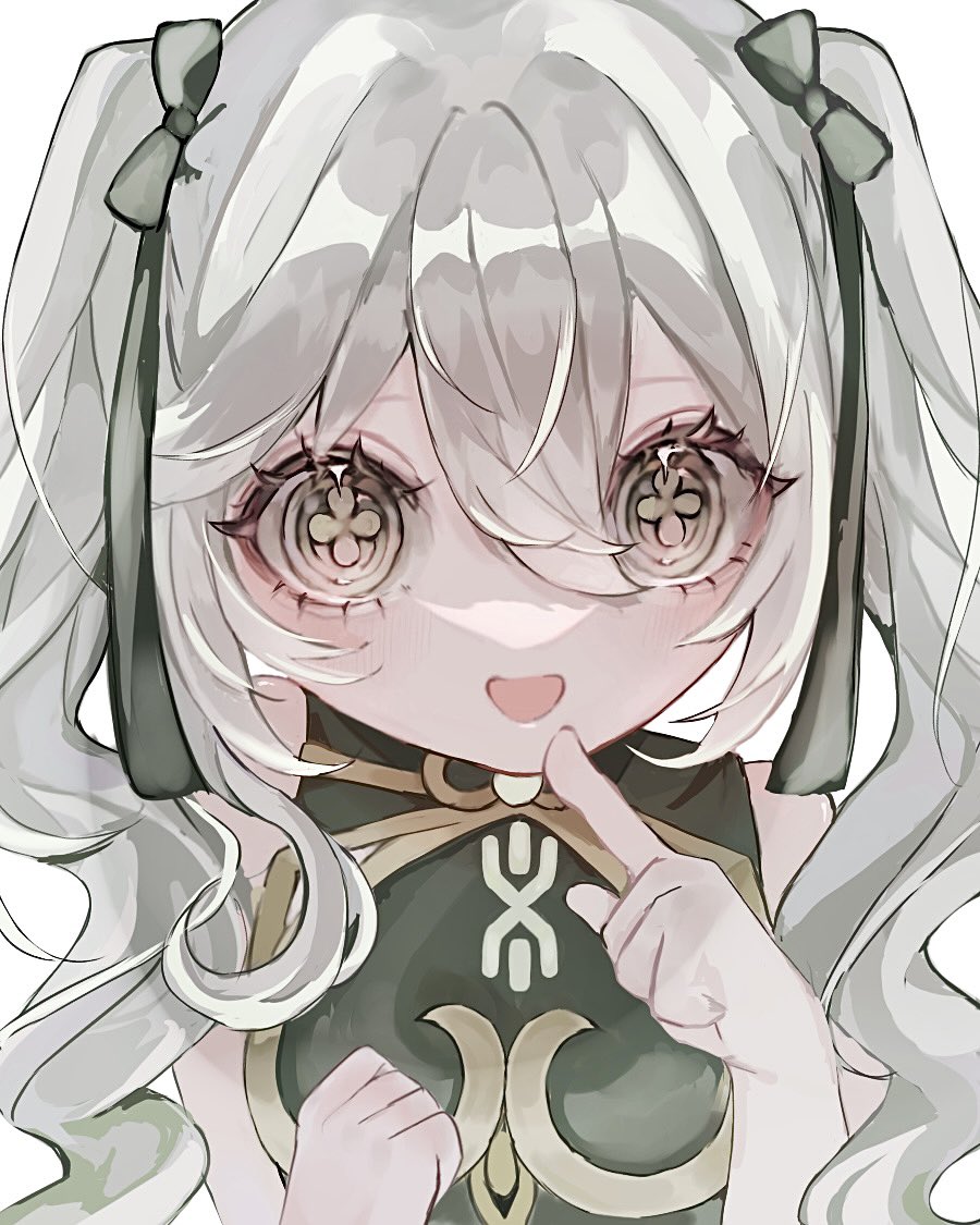 1girl child flower-shaped_pupils genshin_impact gradient_hair hair_ornament hair_tie mamamam_pi multicolored_hair nahida_(genshin_impact) pointing pointing_at_self ponytail smile symbol-shaped_pupils twintails