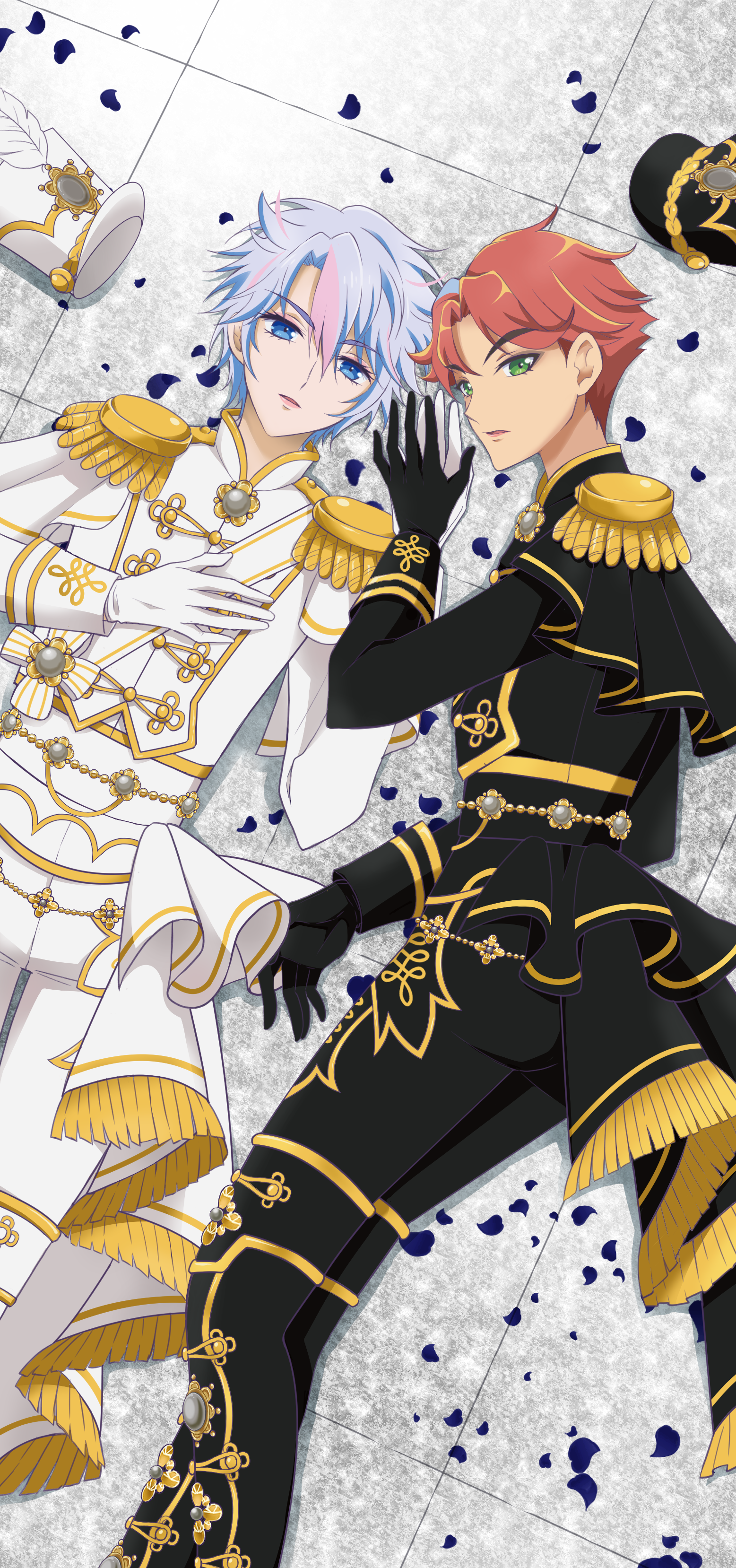 2boys absurdres black_footwear black_gloves black_headwear black_jacket black_pants blue_eyes blue_hair boots brooch buttons capelet commentary cummerbund double-breasted epaulettes feet_out_of_frame fringe_trim gem gloves green_eyes hair_between_eyes hair_flaps hand_on_own_chest hat hat_feather highres holding_hands hughie_(pretty_series) ibuki_touma ibuki_touma_(primagista) idol_clothes jacket jewelry kikuta_michiyo lipstick long_sleeves looking_at_viewer lying makeup male_focus multicolored_hair multiple_boys on_back on_floor orange_hair pants parted_bangs pearl_(gemstone) petals pink_hair pink_lips pretty_series sash shako_cap short_hair shoulder_sash sleeve_cuffs streaked_hair untranslatable_commentary thigh_boots tile_floor tiles unworn_hat unworn_headwear waccha_primagi! waist_cape white_capelet white_footwear white_gloves white_headwear white_jacket white_pants