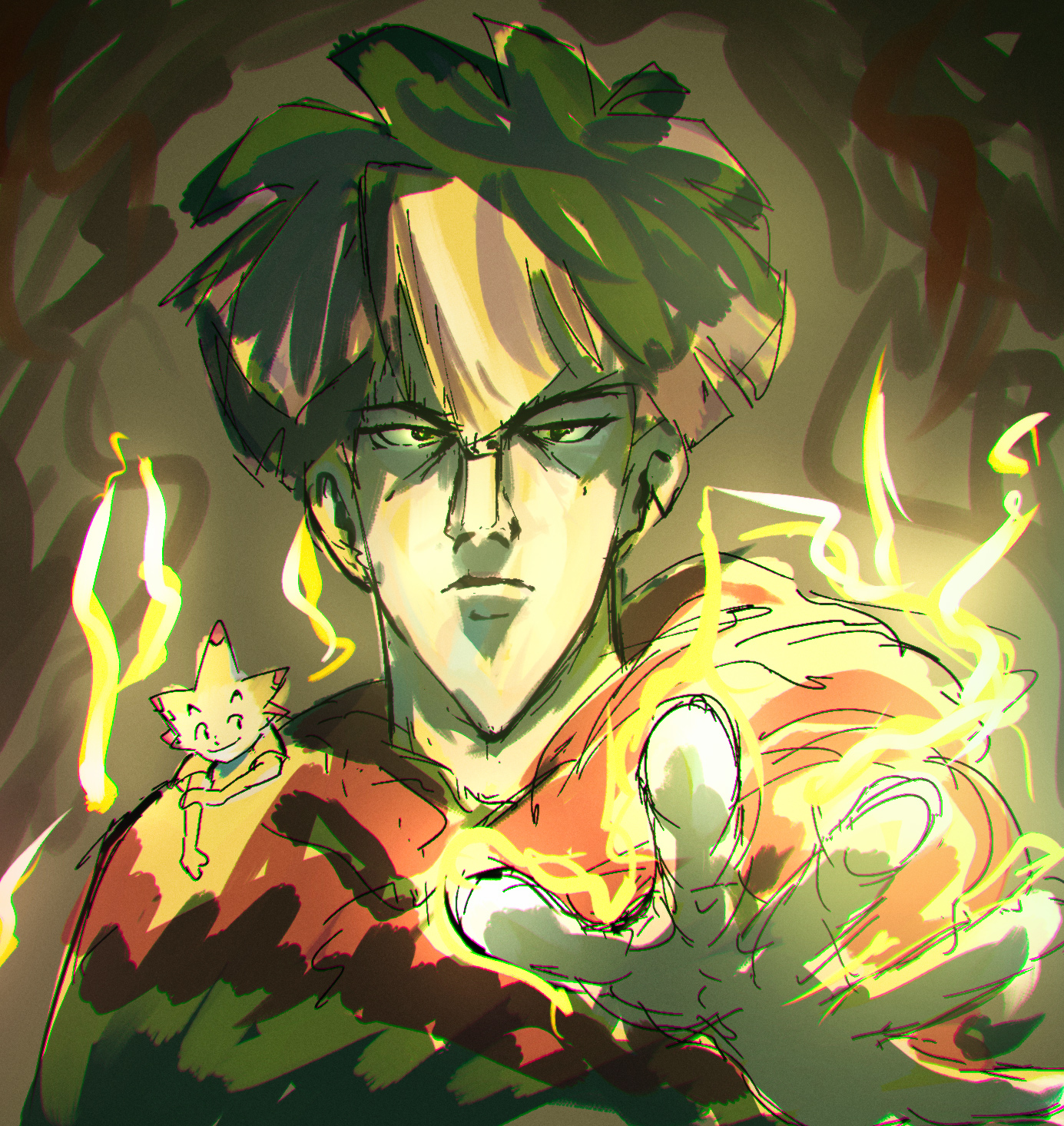 amanokawa_hiro brown_hair digimon digimon_(creature) energy gammamon highres kubota_keita open_hand short_hair triceratops what bad_tag