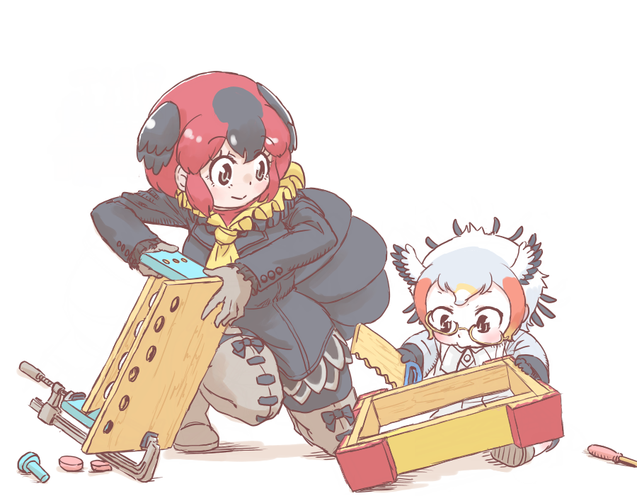 2girls aged_down australian_brushturkey_(kemono_friends) bird_girl bird_wings black_gloves black_hair black_jacket black_pantyhose black_skirt blonde_hair blush boots brown_eyes brown_footwear c-clamp child frilled_sleeves frills gloves grey_gloves hair_between_eyes head_wings jacket kemono_friends long_sleeves maki_(02uh14l1b740ao2) multicolored_hair multiple_girls neck_ruff neckerchief orange_hair pantyhose pleated_skirt red_hair saw secretarybird_(kemono_friends) semi-rimless_eyewear shirt short_hair sidelocks skirt thigh_boots two-tone_hair white_hair white_shirt wings wood yellow-framed_eyewear yellow_neckerchief