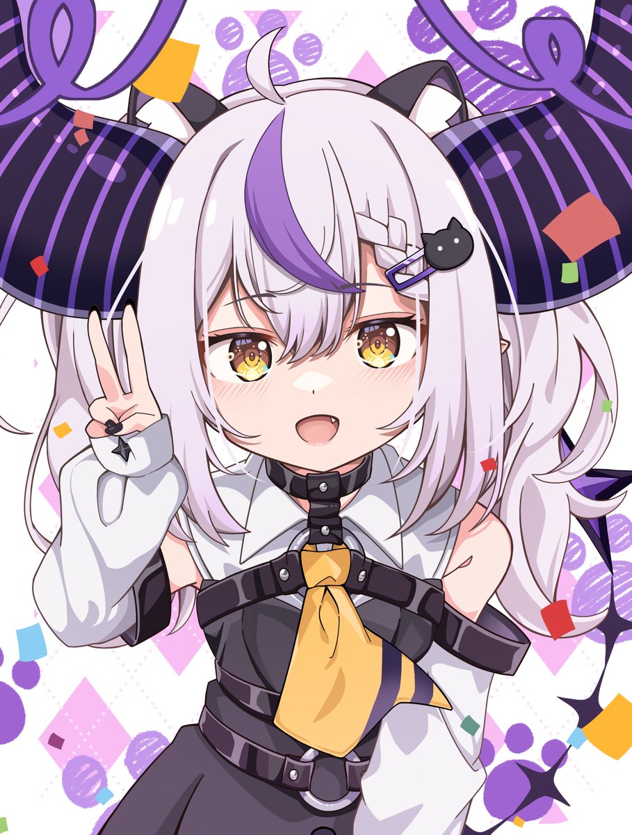 1girl ahoge animal_ear_fluff animal_ears ascot bare_shoulders black_horns black_nails braid braided_bangs cat_hair_ornament collar detached_sleeves fang hair_ornament highres hololive horns kyabetsu_ningen la+_darknesss la+_darknesss_(1st_costume) metal_collar multicolored_hair o-ring open_mouth pointy_ears purple_hair solo streaked_hair striped_horns v virtual_youtuber yellow_ascot yellow_eyes