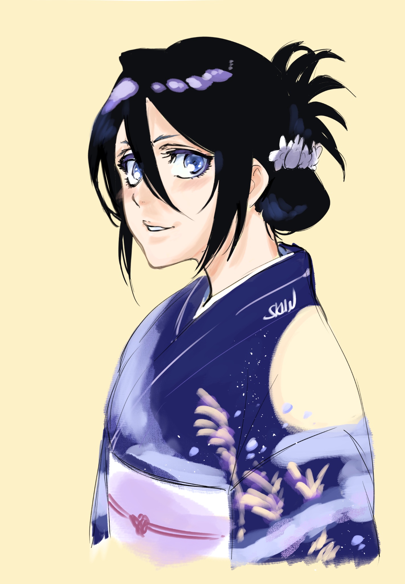 1girl black_hair bleach blush cropped_torso hair_between_eyes hair_bun highres japanese_clothes kimono kuchiki_rukia looking_at_viewer pink_sash purple_eyes purple_kimono sash sekihan_(6kihan) sidelocks smile solo upper_body yellow_background