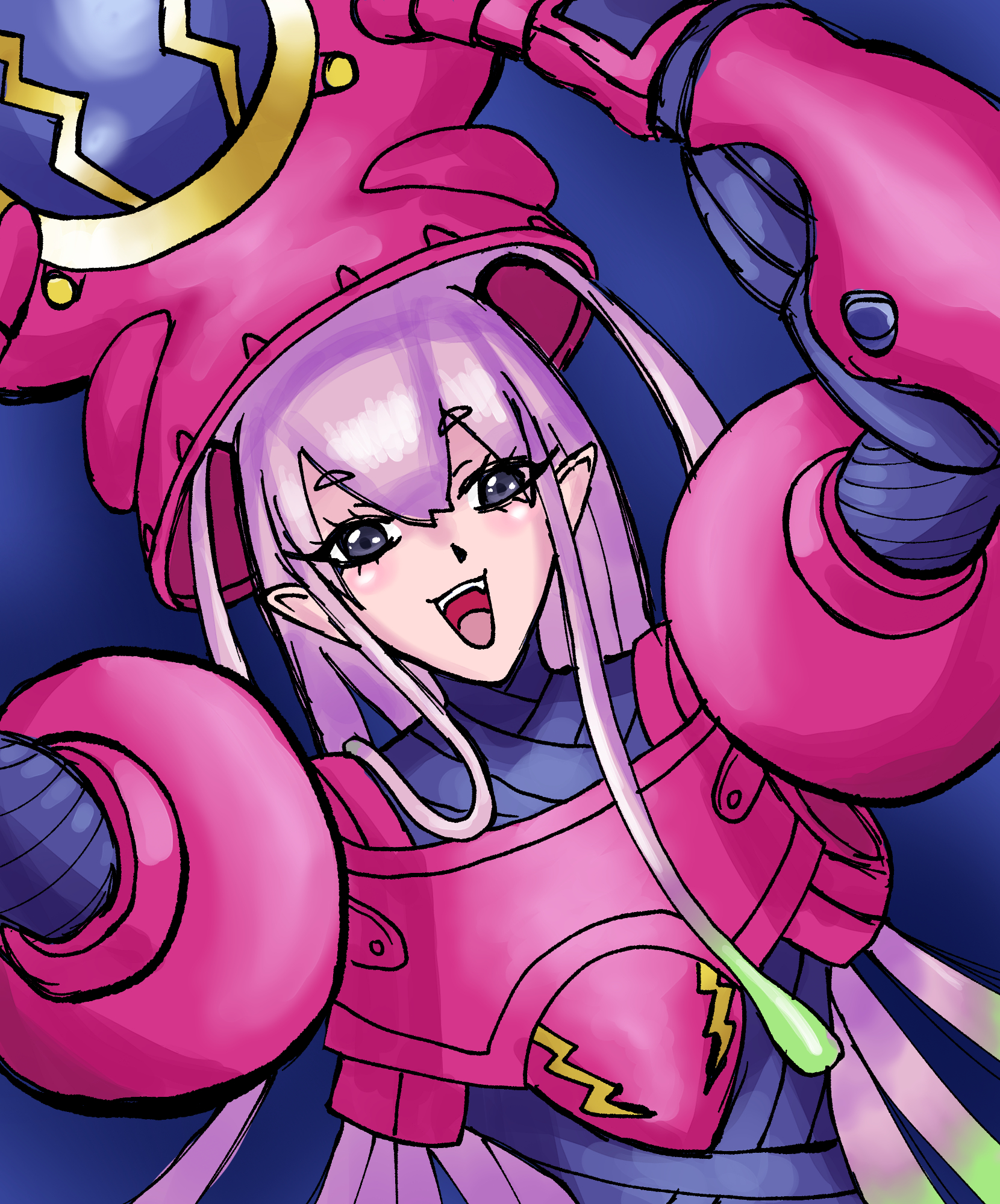amphimon armor digimon digimon_(creature) green_hair highres long_hair multicolored_hair open_mouth original pink_hair purple_eyes smile tentacle_hair