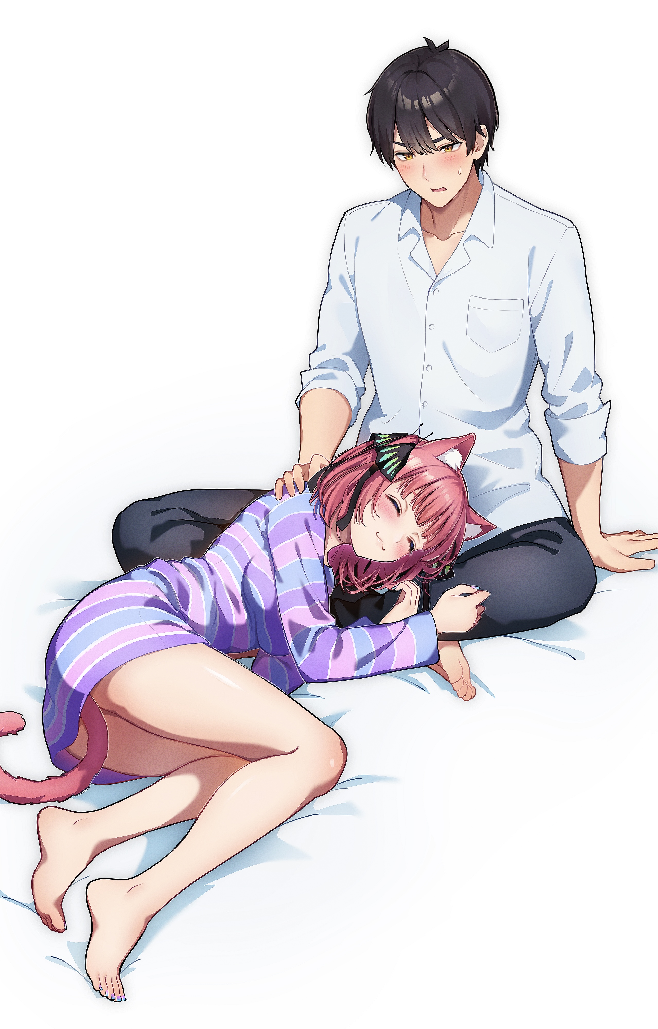 1boy 1girl :3 absurdres animal_ears bare_legs barefoot bed_sheet black_hair black_pants black_ribbon blue_shirt blunt_bangs blush bob_cut breast_pocket breasts brown_eyes butterfly_hair_ornament cat_ears cat_girl cat_tail closed_eyes collared_shirt commentary_request dress_shirt feet go-toubun_no_hanayome hair_ornament highres indian_style kemonomimi_mode kurosaki_coco lap_pillow large_breasts legs long_sleeves lying multicolored_shirt nail_polish nakano_nino on_side pants pink_hair pink_shirt pocket purple_shirt ribbon shirt short_hair sitting sleeping sleeping_on_person sweatdrop tail toenail_polish toenails toes uesugi_fuutarou white_shirt