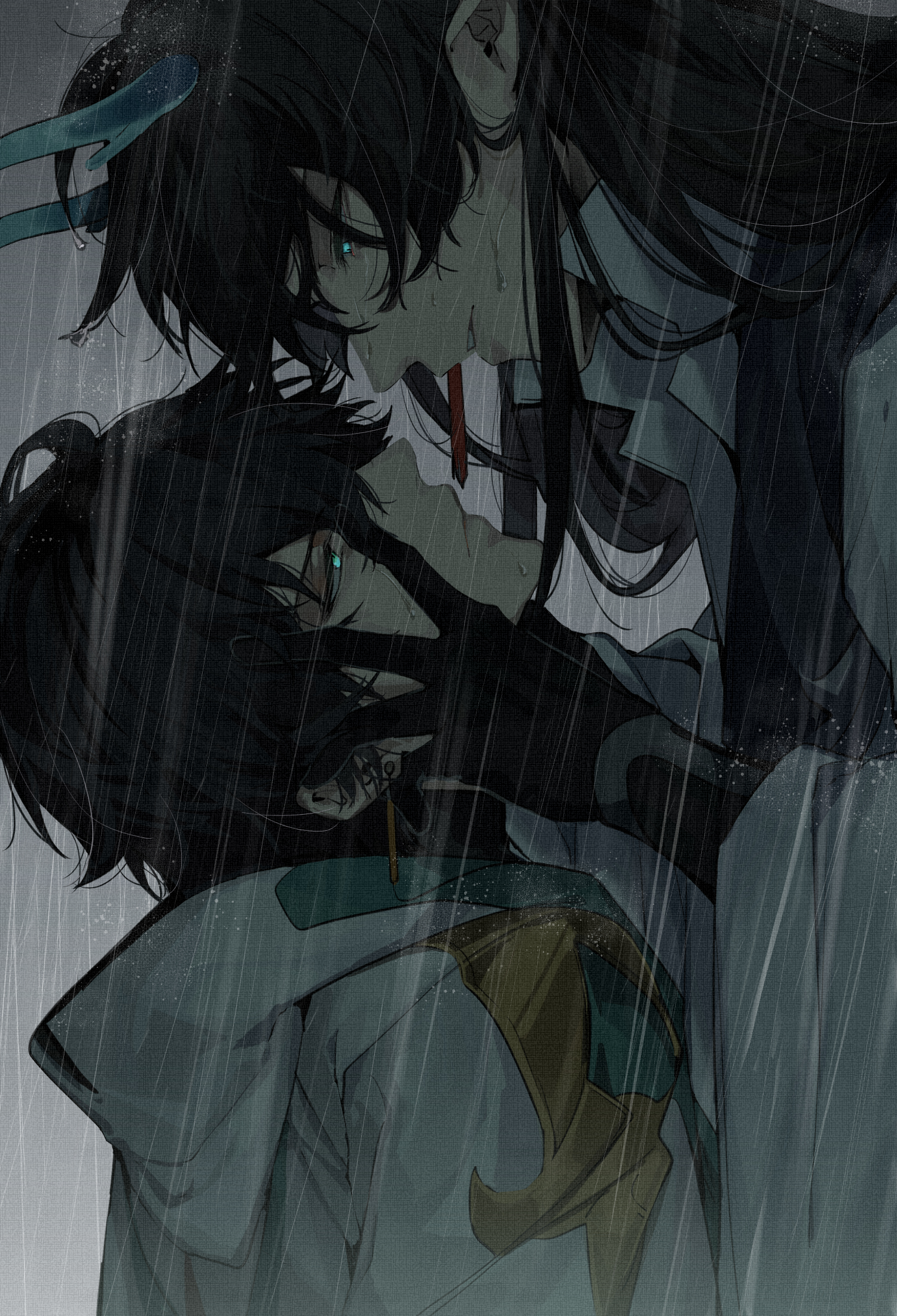 2boys ahoge black_gloves black_hair chinese_clothes chinese_commentary closed_mouth coat dan_feng_(honkai:_star_rail) dan_heng_(honkai:_star_rail) dan_heng_(imbibitor_lunae)_(honkai:_star_rail) dragon_boy dragon_horns dual_persona earrings futon_(ftn_7118) gloves grabbing_another's_face green_eyes green_horns hair_between_eyes head_grab highres honkai:_star_rail honkai_(series) horns jewelry long_hair long_sleeves looking_at_viewer male_focus multiple_boys parted_lips pointy_ears rain short_hair upper_body white_coat wide_sleeves