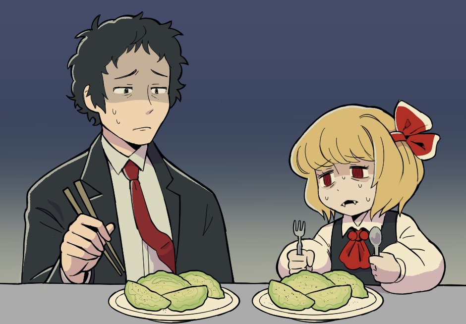 1boy 1girl adachi_tooru black_jacket blonde_hair cabbage chopsticks commentary crimes_against_food crossover empty_eyes fangs fork frown holding holding_chopsticks holding_fork holding_spoon jacket long_sleeves necktie persona persona_4 plate puffy_long_sleeves puffy_sleeves red_eyes red_necktie rumia saurit shaded_face spoon touhou