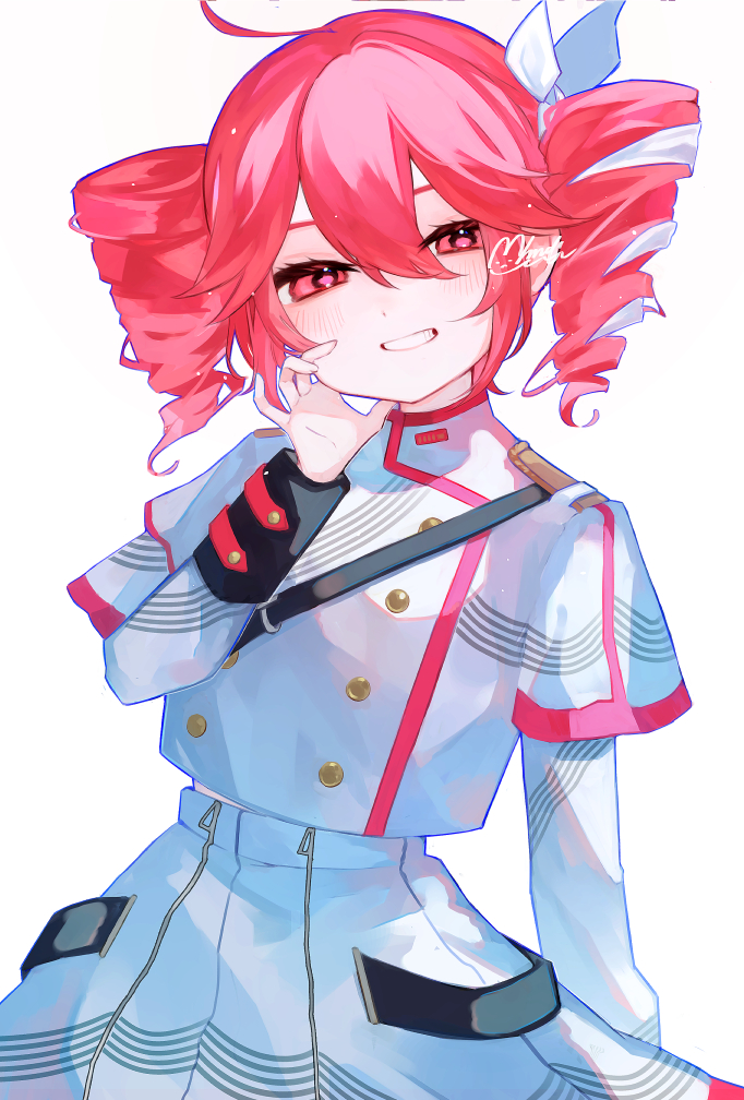 1girl ahoge blush bow buttoned_cuffs buttons cosplay dot_pupils double-breasted drill_hair grey_jacket grey_skirt hair_between_eyes hand_on_own_cheek hand_on_own_face jacket kasane_teto kasane_teto_(cosplay) kasane_teto_(sv) layered_skirt mihanada_mui musical_staff_print parted_lips red_eyes red_hair red_trim shoulder_belt shoulder_boards shoulder_strap signature simple_background skirt sleeve_cuffs smile solo musical_staff striped synthesizer_v teeth tsurime twin_drills uniform upper_body utau white_background white_bow