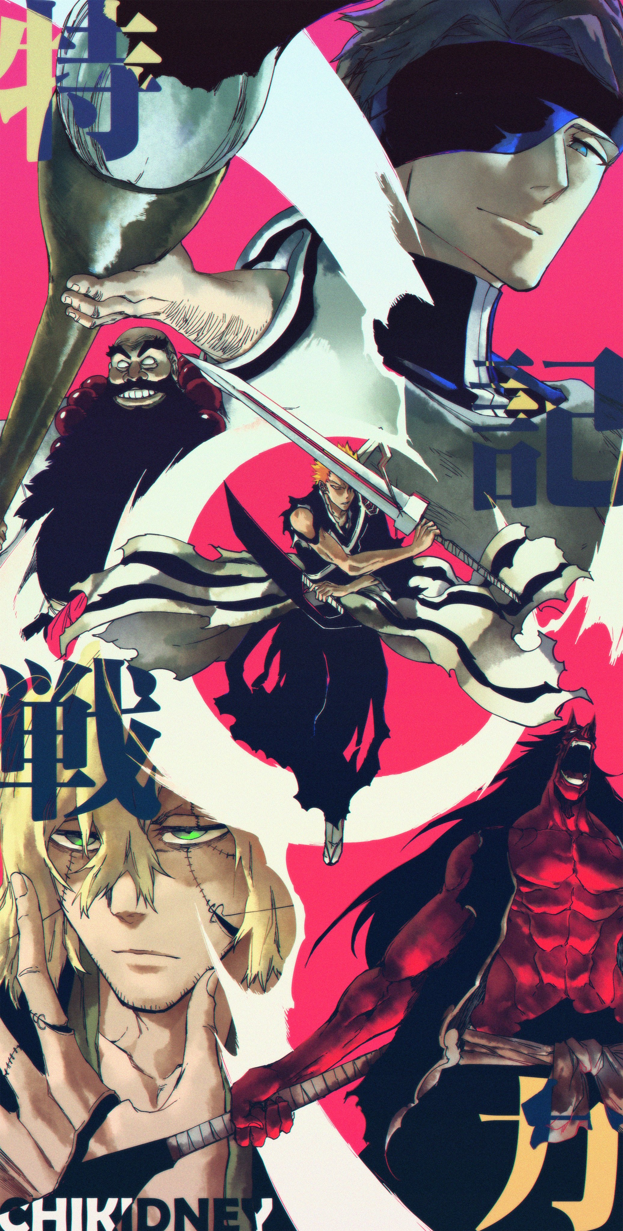 5boys abs absurdres aizen_sousuke arm_hair armor artist_name asymmetrical_dual_wielding axe bald bead_necklace beads beard beard_stubble black_hair black_hakama bleach bleach:_sennen_kessen-hen blonde_hair brown_hair chikidney colored_skin crescent dual_wielding evil_smile eyepatch facial_hair green_eyes hair_between_eyes hakama highres holding holding_axe holding_paintbrush holding_sword holding_weapon horns hyousube_ichibei japanese_clothes jewelry kurosaki_ichigo long_beard long_hair looking_down medium_hair multiple_boys necklace no_pupils obi one_eye_covered oni_horns open_mouth orange_eyes orange_hair paintbrush red_background red_skin sandals sash screaming shihakusho shoulder_armor single_horn sleeveless smile stitched_face stitched_hand stitches stubble sword tabi thick_eyebrows torn_clothes true_zangetsu_(shikai) urahara_kisuke weapon wide_sleeves zanpakutou zaraki_kenpachi