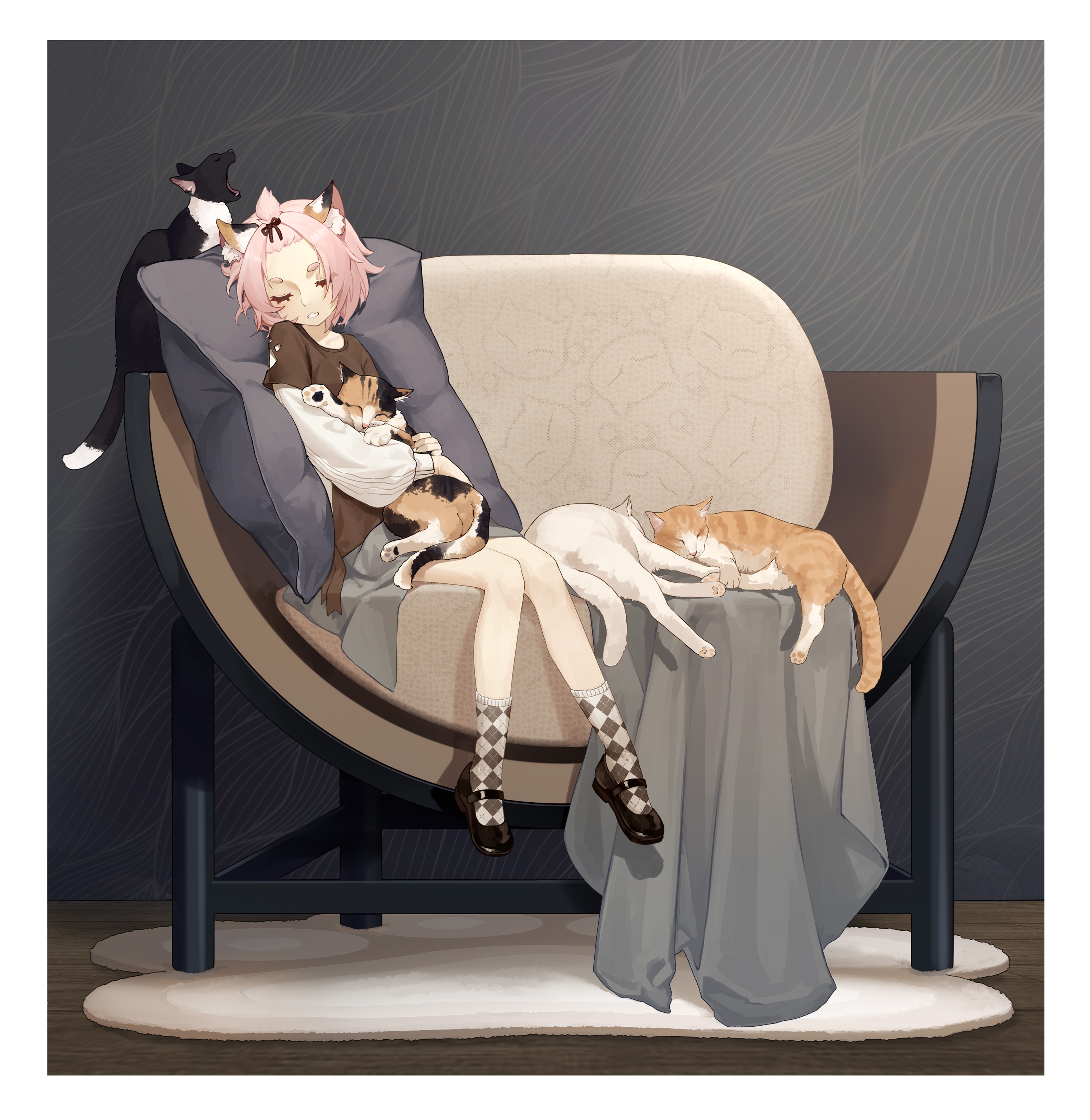 1girl absurdres alternate_costume animal animal_ears animal_hug animal_print baiyinzhideng black_footwear blanket border brown_shirt carpet casual cat cat_ears cat_girl cat_print chair checkered_clothes checkered_legwear closed_eyes cushion diona_(genshin_impact) genshin_impact grey_background highres long_sleeves multiple_cats on_chair open_mouth patterned_legwear pink_hair shirt short_hair sidelocks sitting solo white_border white_sleeves yawning