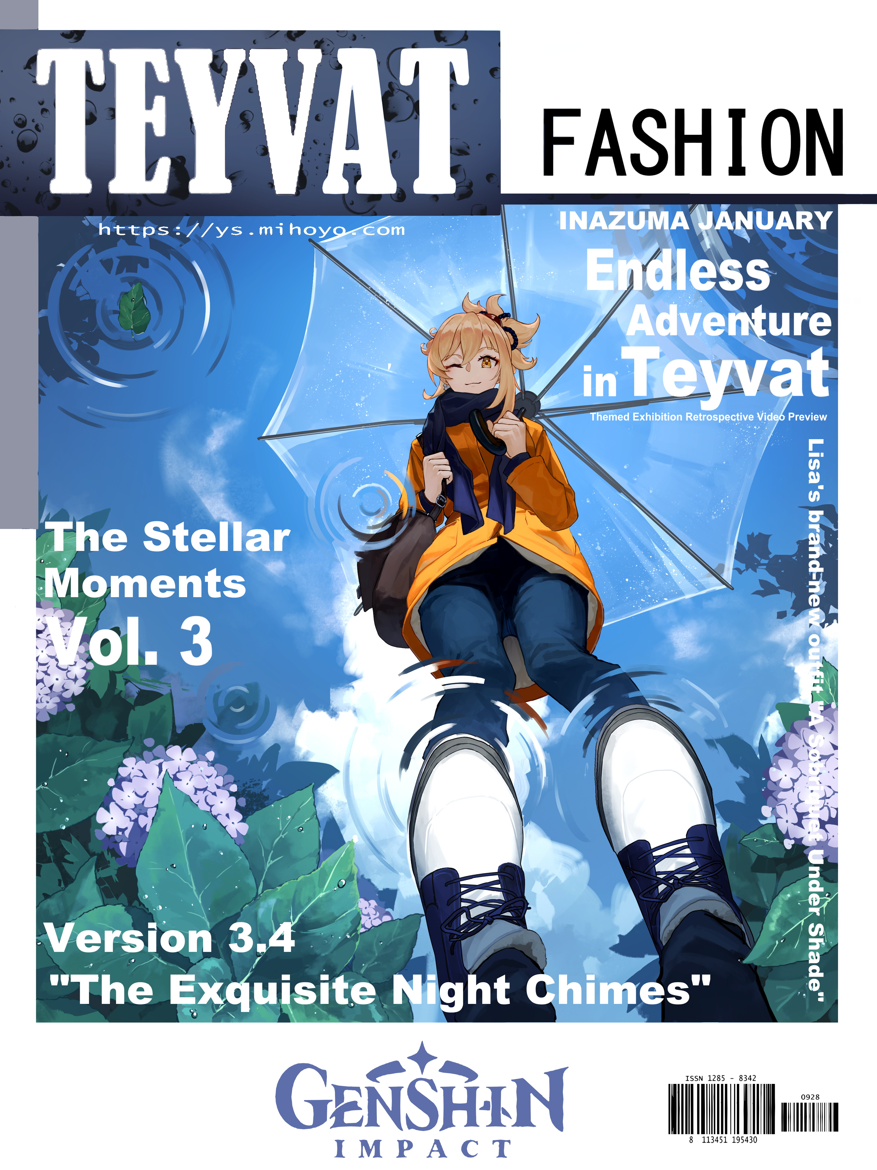 1girl absurdres alternate_costume bag baiyinzhideng barcode blonde_hair blue_footwear blue_pants blue_scarf brown_bag casual closed_mouth copyright_name cover english_text fake_magazine_cover full_body genshin_impact hands_up highres holding holding_umbrella jacket leaf looking_at_viewer looking_down magazine_cover medium_hair one_eye_closed orange_eyes orange_jacket pants puddle reflection reflection_focus scarf shoulder_bag sidelocks solo standing transparent transparent_umbrella two-tone_footwear umbrella watermark web_address white_footwear yoimiya_(genshin_impact)