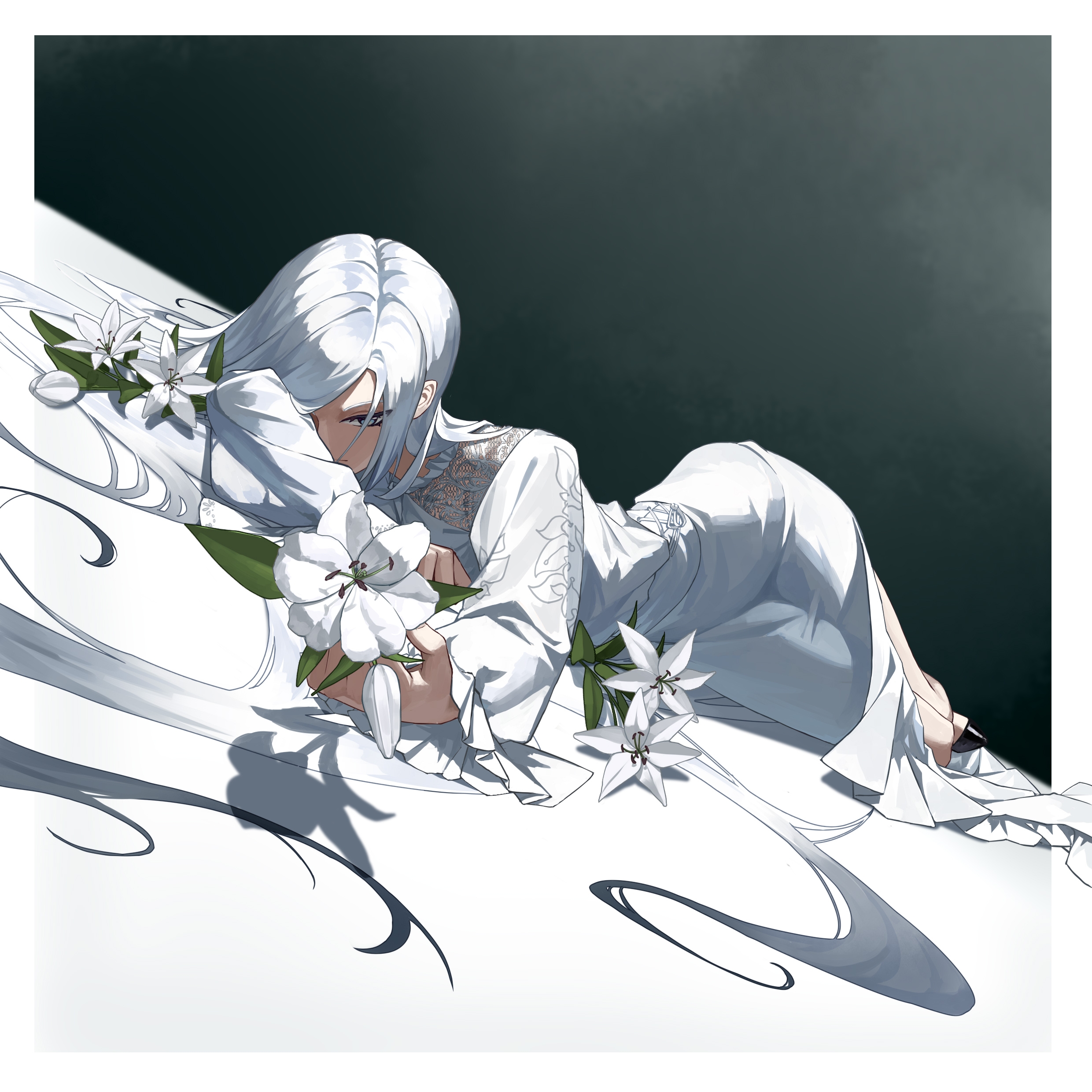 1girl absurdres alternate_costume arms_up baiyinzhideng black_footwear casual closed_mouth dark_background dress floral_print flower frilled_sleeves frills full_body genshin_impact hair_spread_out head_on_arm high_heels highres hobble_dress holding holding_flower long_dress long_sleeves looking_at_viewer lying on_floor on_side qingxin_flower shenhe_(genshin_impact) solo white_dress white_eyes white_hair