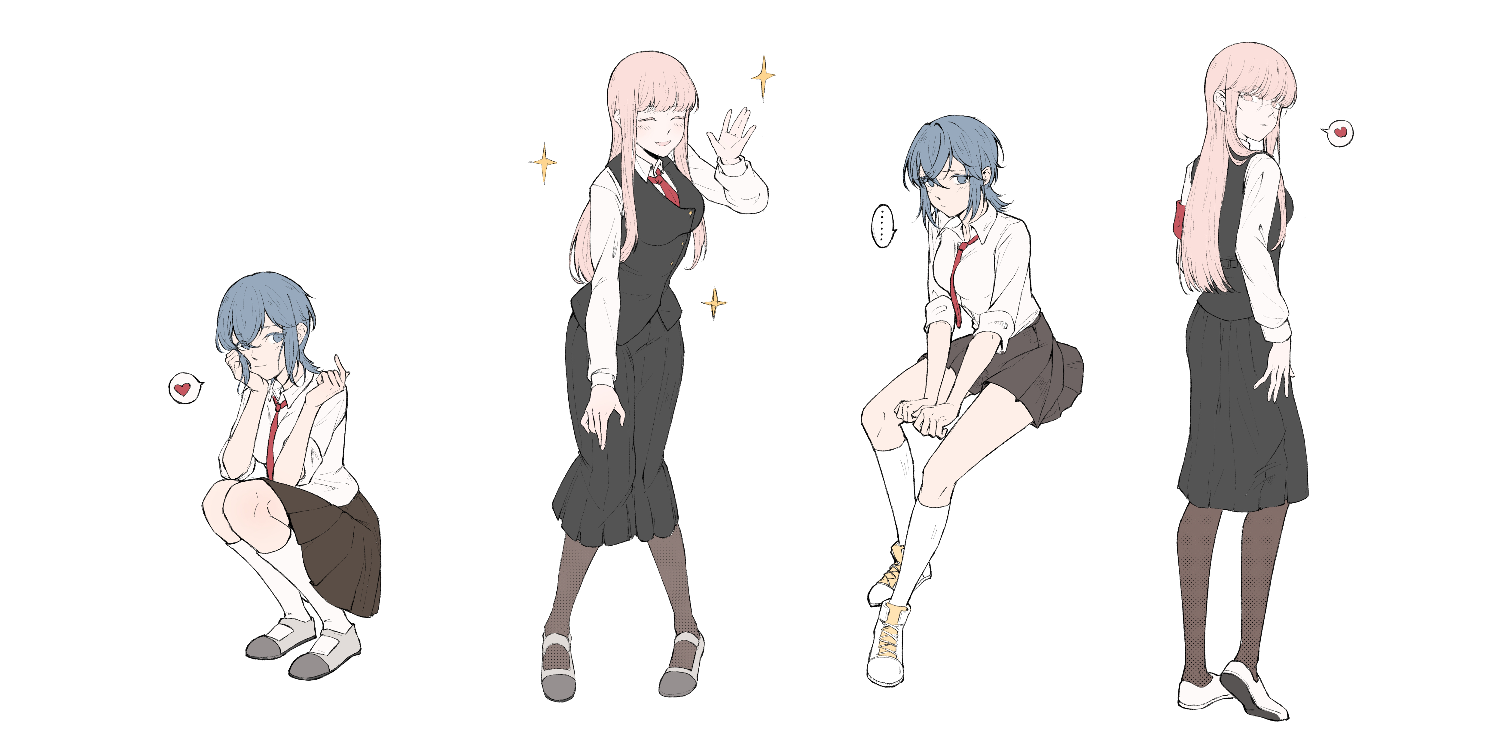 ... absurdres arm_support armband asahina_yuni black_pantyhose black_skirt black_vest blue_eyes blue_hair blush breasts brown_skirt chinese_commentary closed_eyes closed_mouth collared_shirt commentary_request dress_shirt full_body glasses grey_footwear hair_between_eyes haoxiangkan_nutong heart highres index_finger_raised invisible_chair kneehighs kyou_wa_kanojo_ga_inai_kara long_hair long_sleeves medium_breasts medium_hair multiple_views necktie open_mouth pantyhose pink_eyes pink_hair pleated_skirt red_armband red_necktie round_eyewear school_uniform shirt sidelocks simple_background sitting skirt sleeves_rolled_up smile socks sparkle spoken_ellipsis spoken_heart squatting taki_fuuko vest waving white_background white_footwear white_shirt white_socks