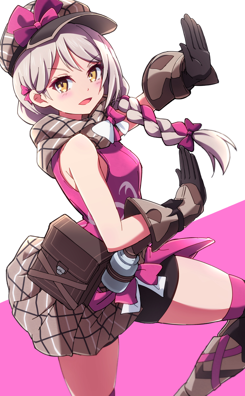 1girl bare_shoulders blonde_hair braid brown_scarf fire_emblem fire_emblem_engage flannel framme_(fire_emblem) highres knee_guards martial_arts minamonochaba nintendo pink_hair plaid_clothes plaid_headwear scarf single_braid solo wrist_guards