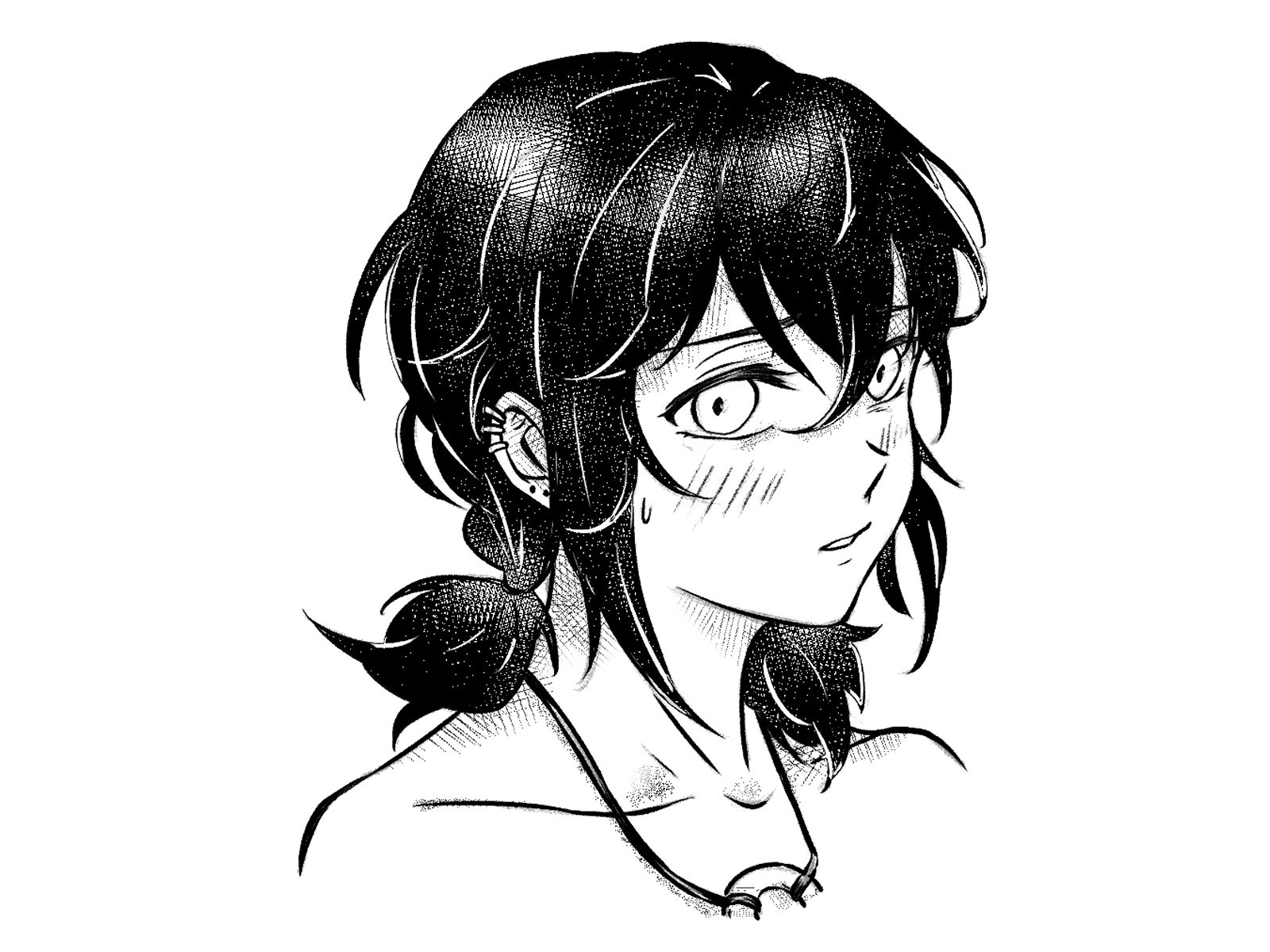 1girl asahina_yuni bare_shoulders blush chinese_commentary collarbone commentary_request cropped_head ear_piercing earrings greyscale hair_between_eyes haoxiangkan_nutong highres jewelry kyou_wa_kanojo_ga_inai_kara looking_at_viewer low_twintails monochrome necklace parted_lips piercing short_twintails sidelocks simple_background solo stud_earrings twintails