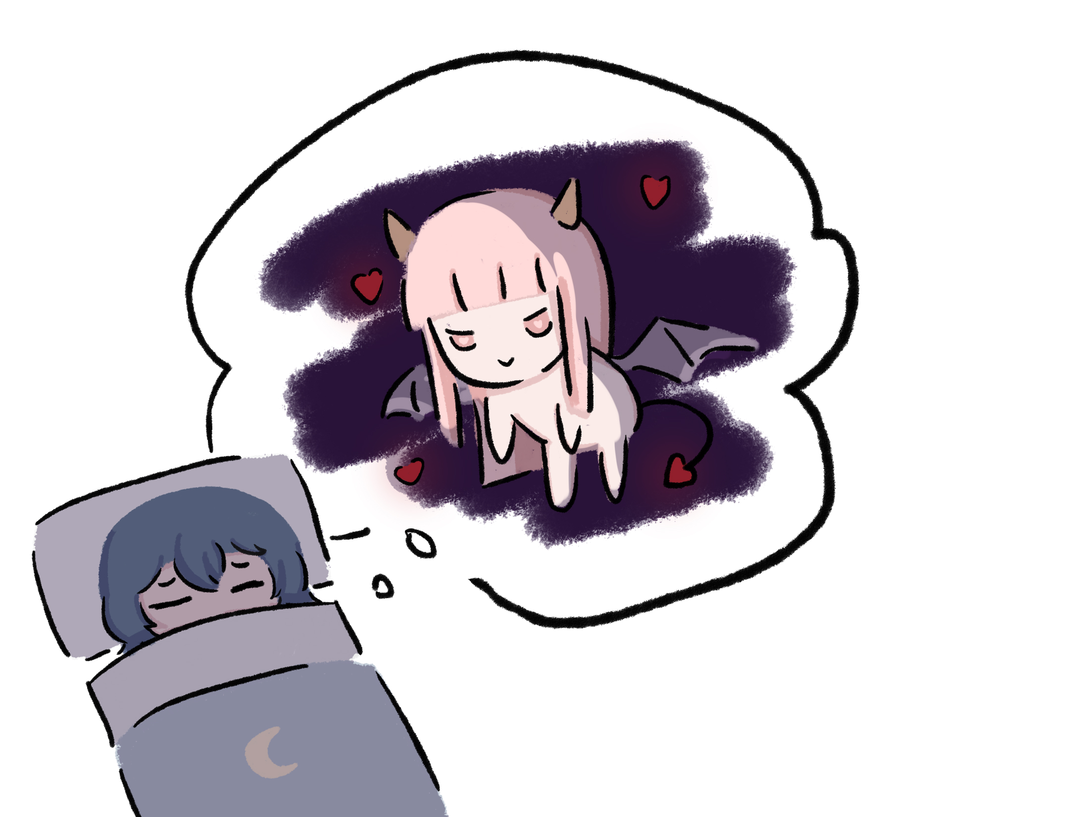 2girls :> asahina_yuni blue_hair blunt_bangs chibi chinese_commentary closed_eyes commentary_request demon demon_horns demon_tail demon_wings haoxiangkan_nutong heart heart-shaped_pupils highres horns kyou_wa_kanojo_ga_inai_kara multiple_girls pink_eyes sidelocks simple_background sleeping speech_bubble symbol-shaped_pupils tail taki_fuuko thought_bubble under_covers white_background wings