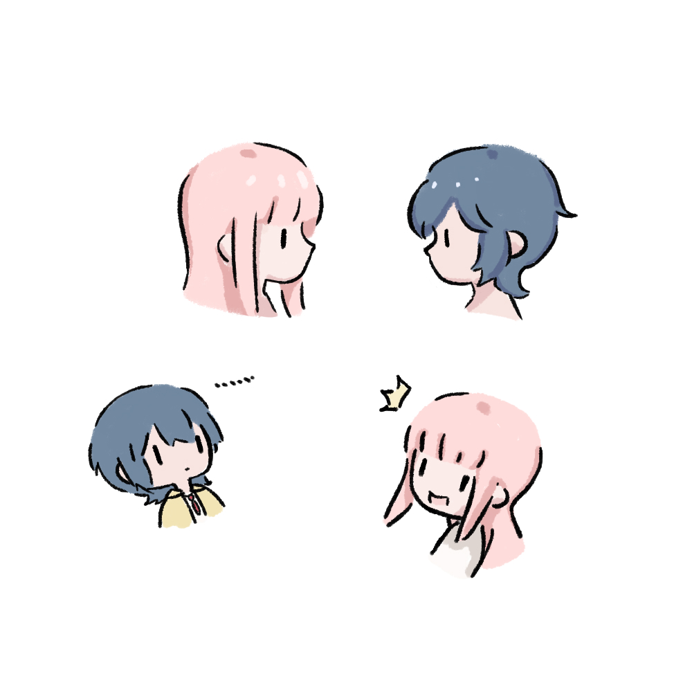 2girls asahina_yuni blue_hair chibi chinese_commentary closed_mouth commentary_request eye_contact haoxiangkan_nutong kyou_wa_kanojo_ga_inai_kara long_hair looking_at_another medium_hair multiple_girls multiple_views open_mouth pink_hair simple_background surprised taki_fuuko upper_body white_background wolf_cut |_|