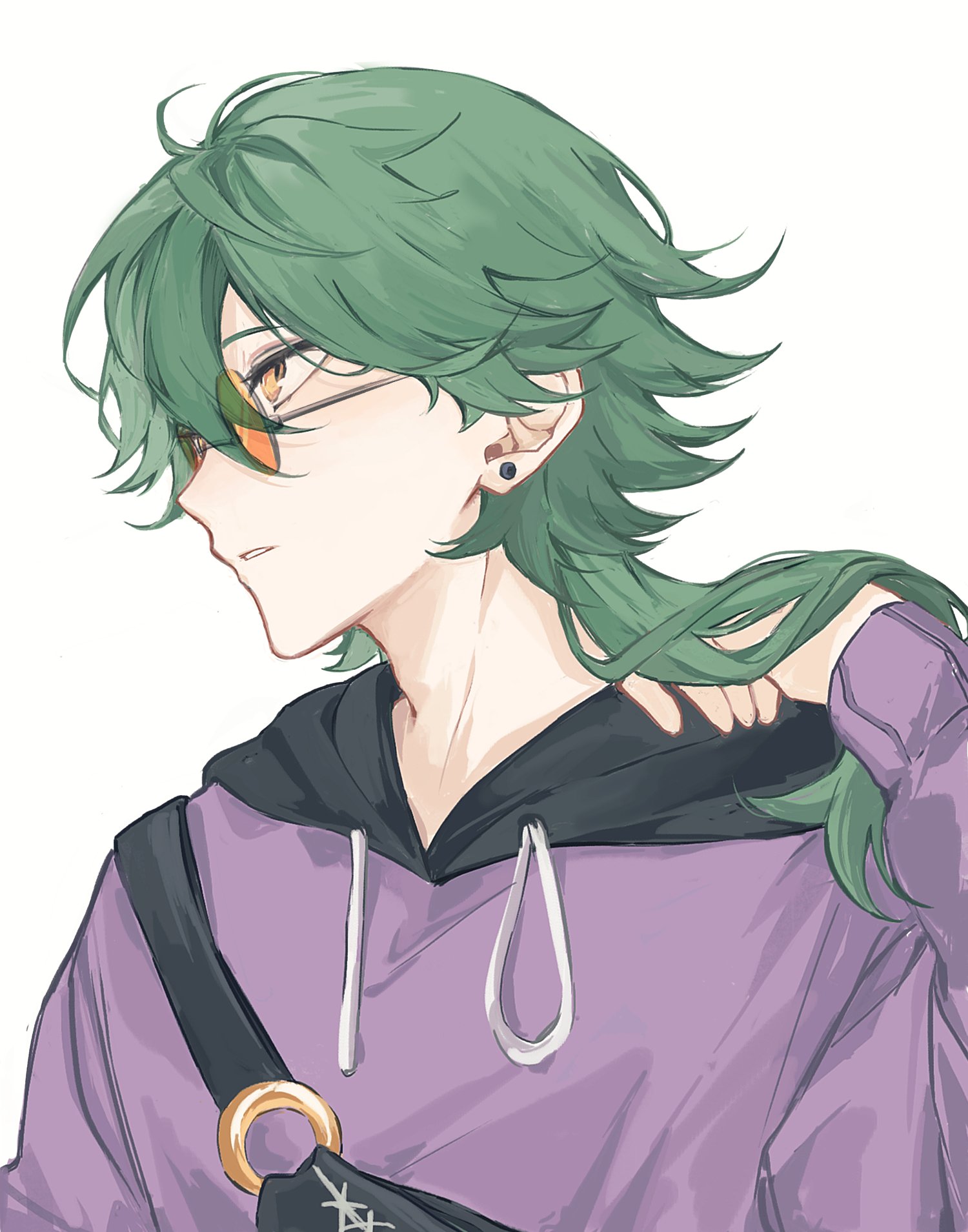 1boy black_hoodie brown_eyes earrings ezreal green_hair hair_between_eyes hand_in_own_hair hand_up heartsteel_ezreal highres hood hood_down hoodie jewelry league_of_legends long_hair looking_to_the_side male_focus mnce_o o-ring orange-tinted_eyewear parted_lips profile purple_hoodie solo sunglasses teeth tinted_eyewear
