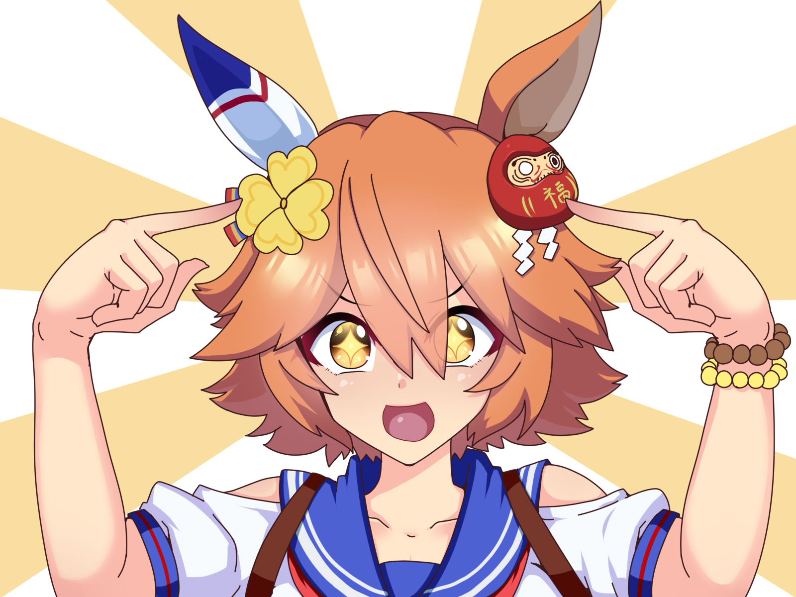 +_+ 1girl animal_ears blue_sailor_collar clothing_cutout clover_hair_ornament daruma_doll ear_covers flipped_hair four-leaf_clover_hair_ornament hair_ornament highres horse_ears horse_girl kamen_no_hito looking_at_viewer matikanefukukitaru_(umamusume) neckerchief open_mouth orange_eyes orange_hair pointing pointing_at_self red_neckerchief sailor_collar shirt short_hair short_sleeves shoulder_cutout single_ear_cover smile solo sunburst sunburst_background umamusume white_shirt
