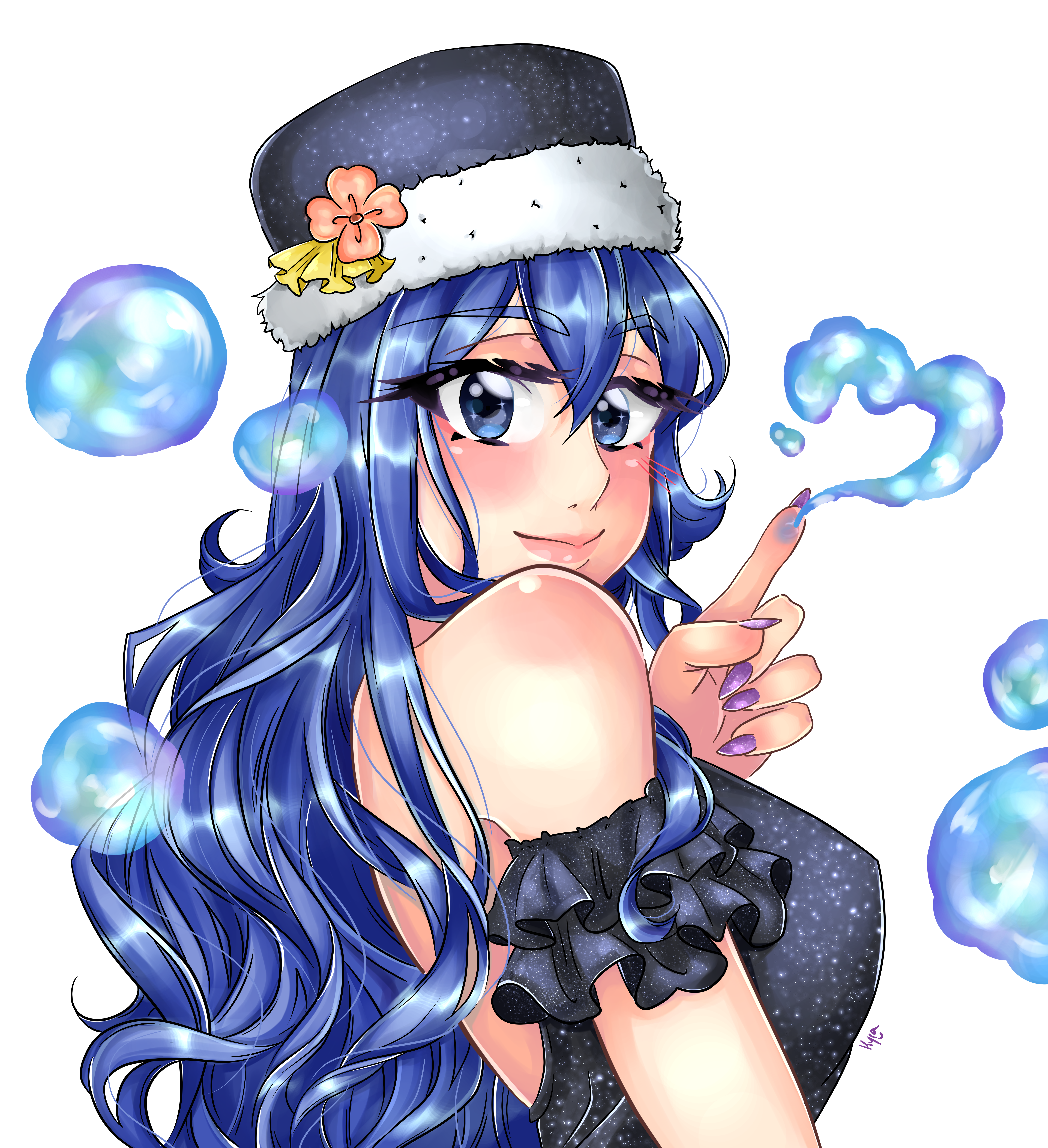 absurdres alpha_transparency black_dress blue_eyes blue_hair blush bubble dress fairy_tail hat highres juvia_lockser kyranyan nail_polish smile water