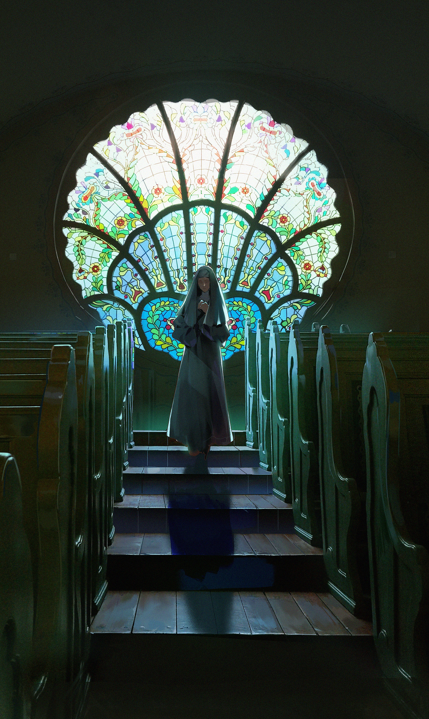 1girl absurdres backlighting bench black_dress black_vest dress facing_viewer habit hands_up highres indoors long_dress long_sleeves no_eyes nun nun_headdress original own_hands_together praying scenery shadow solo stained_glass stairs standing traditional_nun veil vest wide_shot wuya_(zhalv)