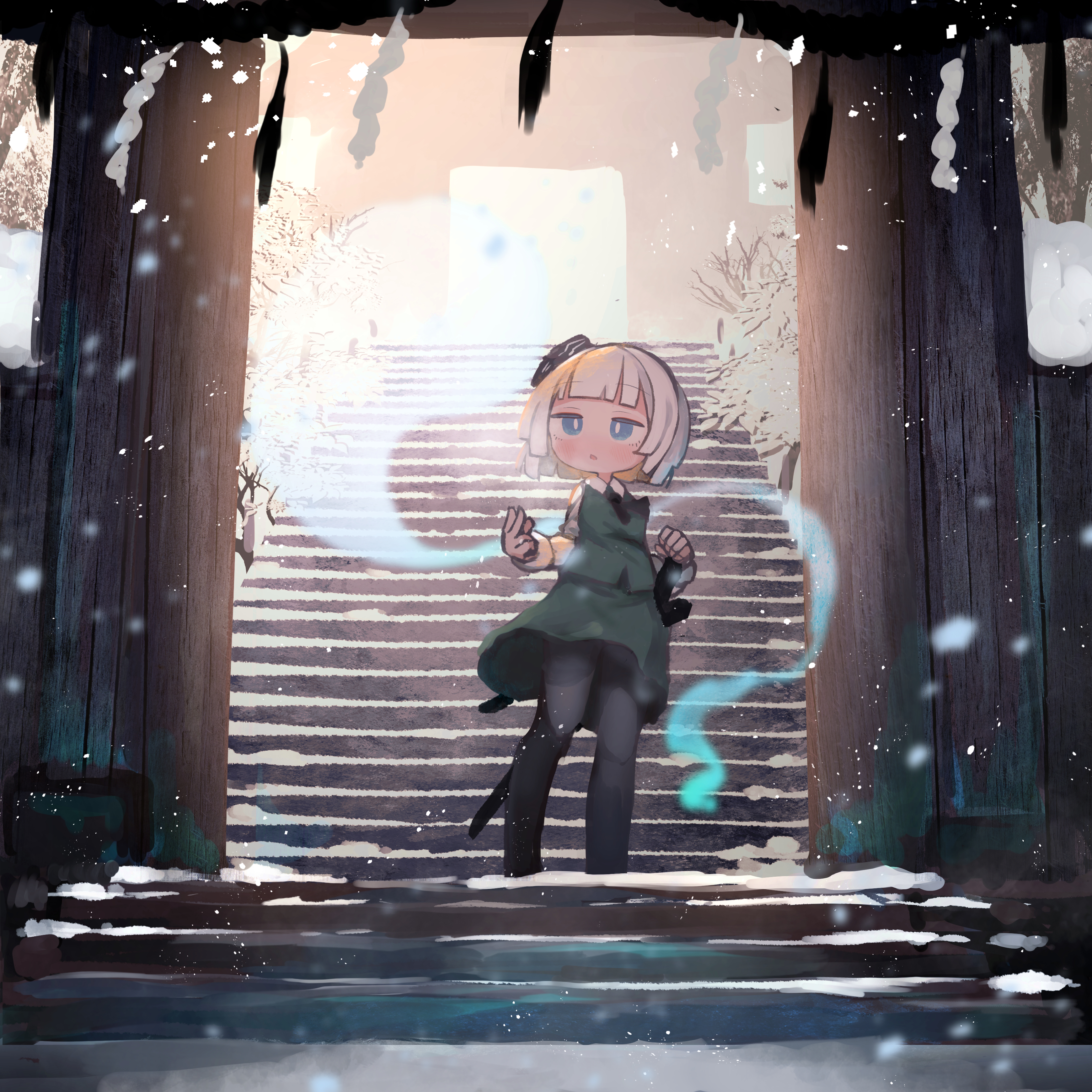 1girl absurdres bare_tree black_hairband black_pantyhose black_ribbon blue_eyes chii_(tsumami_tsumamare) collared_shirt commentary full_body green_skirt green_vest grey_hair hair_ribbon hairband highres hitodama konpaku_youmu konpaku_youmu_(ghost) long_sleeves outdoors pantyhose ribbon shirt short_hair skirt snow snowing solo stairs standing untranslatable_commentary touhou tree vest white_shirt