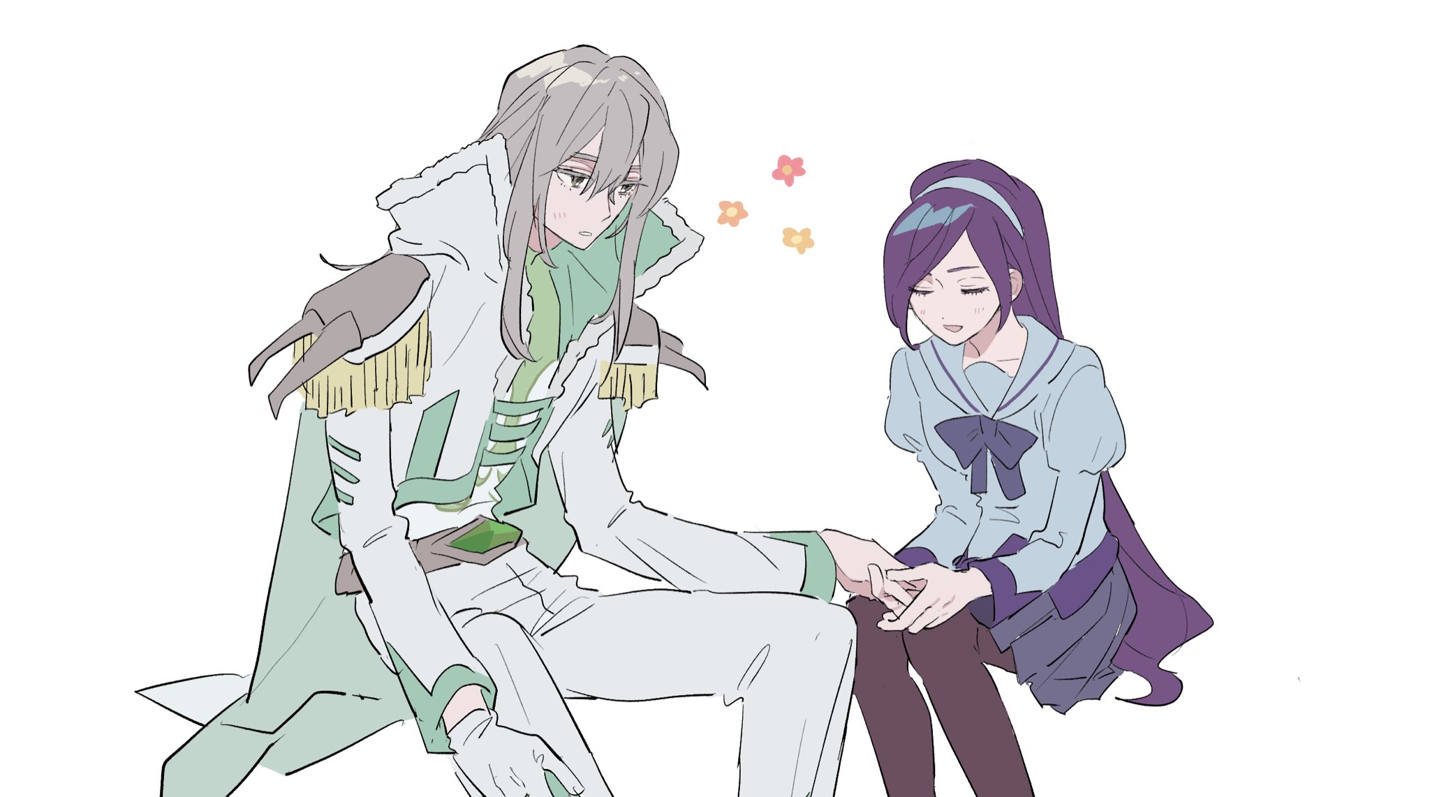 1boy 1girl aono_miki belt blue_hair blue_shirt closed_eyes eyelashes flat_color flower fresh_precure! gloves green_eyes grey_hair headband highres holding_hands light_blush long_hair long_sleeves open_mouth pantyhose pleated_skirt precure puffy_sleeves ribbon school_uniform shirt simple_background skirt souler_(precure) w6kyh white_gloves