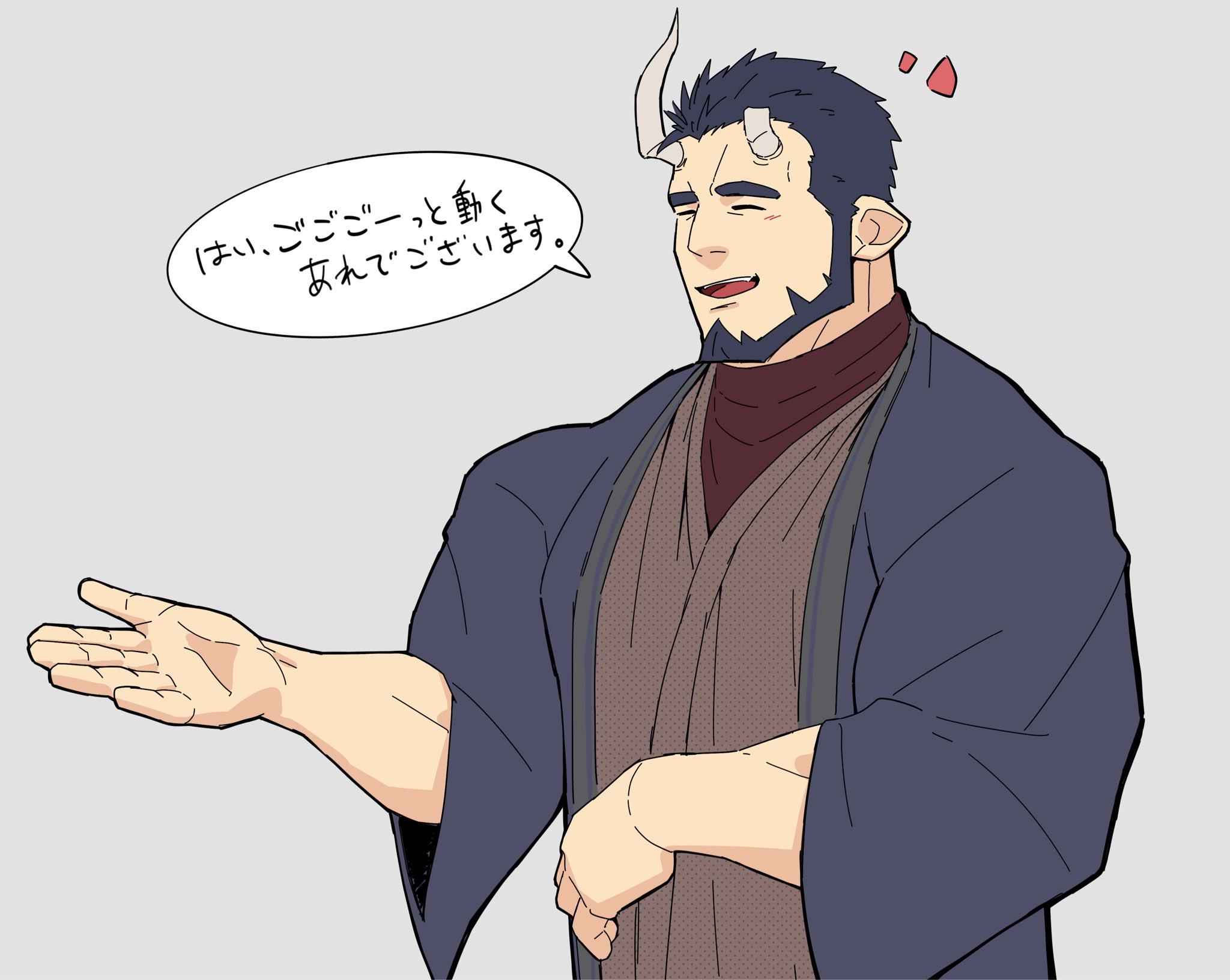 1boy ^_^ bara beard black_hair blush broken_horn closed_eyes demon_boy demon_horns facial_hair from_side haori happy happy_aura highres horns japanese_clothes kansuke_(kansuke_717) kimono large_pectorals live_a_hero male_focus mature_male muscular muscular_male nessen_(live_a_hero) official_alternate_costume otstretched_hand pectorals short_hair smile solo thick_eyebrows translation_request upper_body