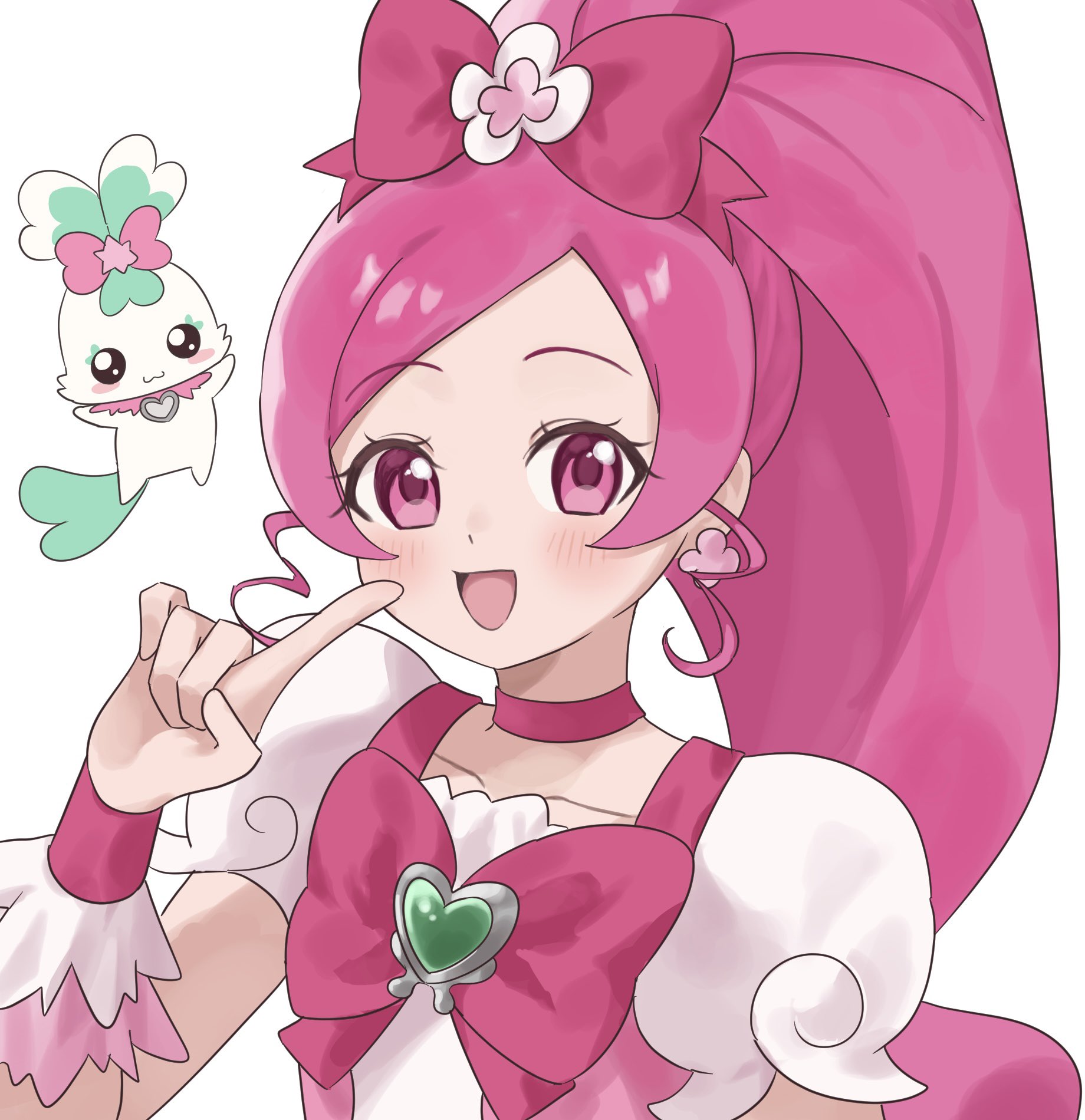 1girl :d blush bow brooch chypre_(precure) collar commentary_request cure_blossom earrings eyelashes flower_earrings frills hair_bow hair_ornament hanasaki_tsubomi heart heart_brooch heartcatch_precure! highres index_finger_raised jewelry looking_at_viewer nemuiyoo00 open_mouth pink_collar pink_eyes pink_hair pointing pointing_at_self ponytail precure puffy_short_sleeves puffy_sleeves short_sleeves simple_background smile white_background wrist_cuffs