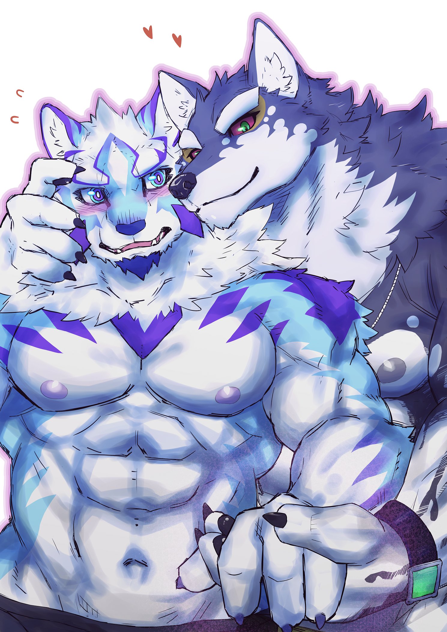 2boys abs animal_ears bara black_claws blue_eyes blush chin_rest colored_sclera commentary embarrassed fangs flying_sweatdrops furry furry_male green_eyes head_grab head_on_head head_rest heart highres holding_hands live_a_hero looking_at_another looking_at_viewer male_focus monomasa_(live_a_hero) multiple_boys open_mouth pawpads pectorals red_sclera sadayoshi_(live_a_hero) sakuhuu untranslatable_commentary thick_eyebrows topless_male white_background wolf_boy wolf_ears