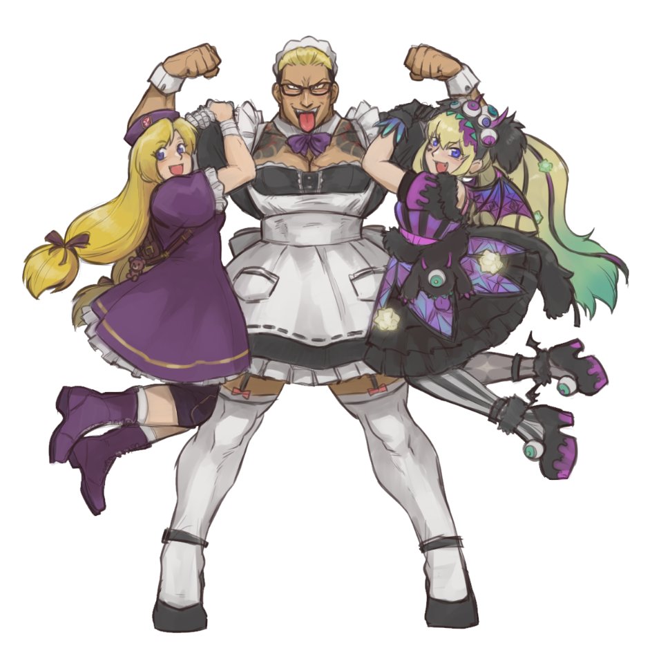 1boy 2girls :d alternate_costume apron bandaged_fingers bandaged_wrist bandages bat_wings beret black_gloves black_hair blonde_hair boots bow bowtie carrying_multiple_people carrying_person commentary detached_collar double_biceps_pose dress english_commentary enmaided eyeball_hair_ornament eyes_visible_through_hair flexing frilled_dress frills full_body garter_straps glasses gloves gradient_hair green_hair hanging_on_arm hat height_difference irezumi knee_pads long_hair looking_at_viewer low-tied_long_hair maid maid_apron maid_headdress mary_janes multicolored_hair multiple_girls muscular muscular_male nyaattoberritto open_mouth platform_boots platform_footwear puffy_short_sleeves puffy_sleeves purple_bow purple_bowtie purple_dress purple_eyes purple_footwear shijou_hinako shoes short_hair short_sleeves simple_background smile striped_clothes striped_thighhighs sylvie_paula_paula tattoo the_king_of_fighters the_king_of_fighters_xv thighhighs tongue tongue_out two-tone_hair vertical-striped_clothes vertical-striped_thighhighs very_long_hair white_background white_thighhighs wings wrist_cuffs yamazaki_ryuuji zettai_ryouiki