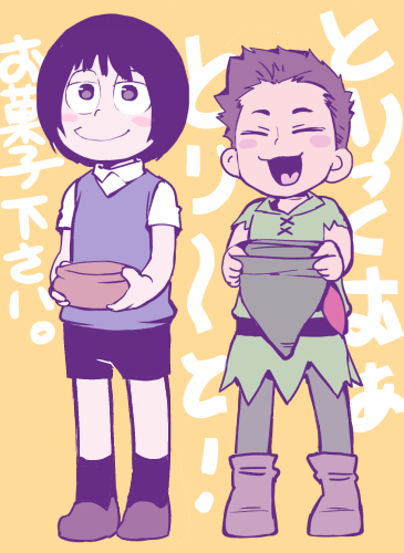 2boys :3 aged_down atsushi_(osomatsu-san) black_hair black_shorts blush_stickers boots bowl brown_hair closed_eyes dark-skinned_male dark_skin green_tunic hat hat_feather holding holding_bowl holding_unworn_clothes holding_unworn_hat lowres male_focus mikado_(jokeraj) multiple_boys open_mouth osomatsu-san osomatsu-san_the_movie osomatsu_(series) shorts smile sweater_vest tunic unworn_hat unworn_headwear yanagita_(osomatsu-san) yellow_background