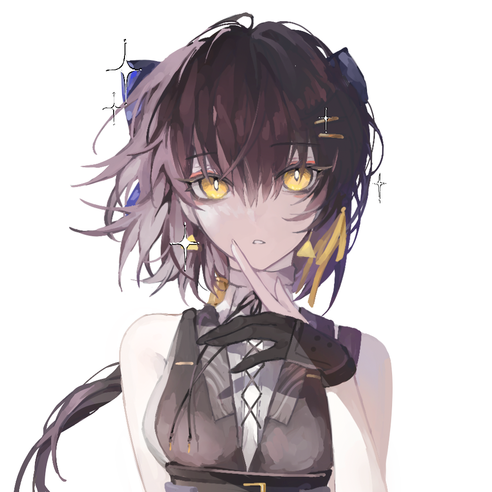 1girl bare_shoulders black_gloves black_shirt brown_hair chinese_commentary commentary cross-laced_clothes cross-laced_top earrings female_rover_(wuthering_waves) floating_earrings gloves hair_between_eyes hair_ornament hair_ribbon hairclip hand_on_own_chin jewelry long_hair looking_at_viewer low_ponytail partially_fingerless_gloves ponytail ribbon rover_(wuthering_waves) shirt simple_background sleeveless sleeveless_shirt solo star_(symbol) straight-on triangle_earrings two-tone_shirt underbust upper_body white_background white_shirt wuthering_waves xiegegege_gezi yellow_eyes yellow_ribbon