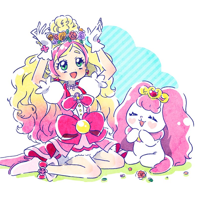 :d arms_up bow brooch closed_eyes cure_flora earrings flower flower_earrings flower_necklace footwear_flower gloves go!_princess_precure green_eyes haruno_haruka head_wreath heart_cheeks hoppetoonaka3 jewelry magical_girl multicolored_hair necklace open_mouth outdoors pink_bow pink_skirt precure puff_(precure) simple_background sitting skirt smile streaked_hair tiara two-tone_hair waist_bow waist_brooch white_gloves