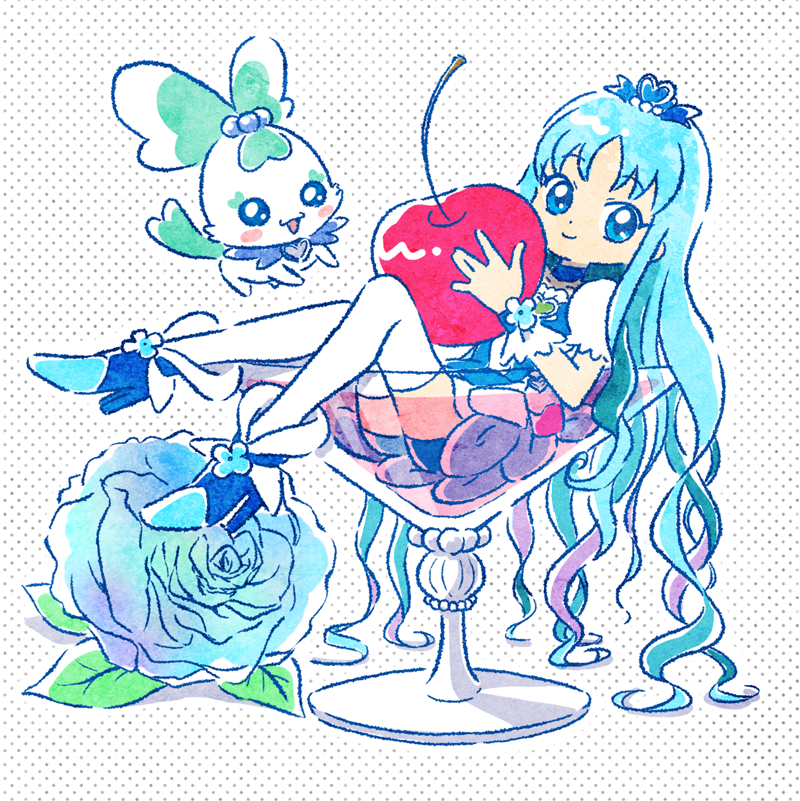 1girl blue_choker blue_eyes blue_flower blue_hair blue_rose brooch cherry choker coffret_(precure) commentary_request cure_marine flower food fruit glass hair_ornament heart heart_brooch heartcatch_precure! holding hoppetoonaka3 jewelry kurumi_erika long_hair looking_at_viewer magical_girl precure rose sitting skirt smile thighhighs wrist_cuffs