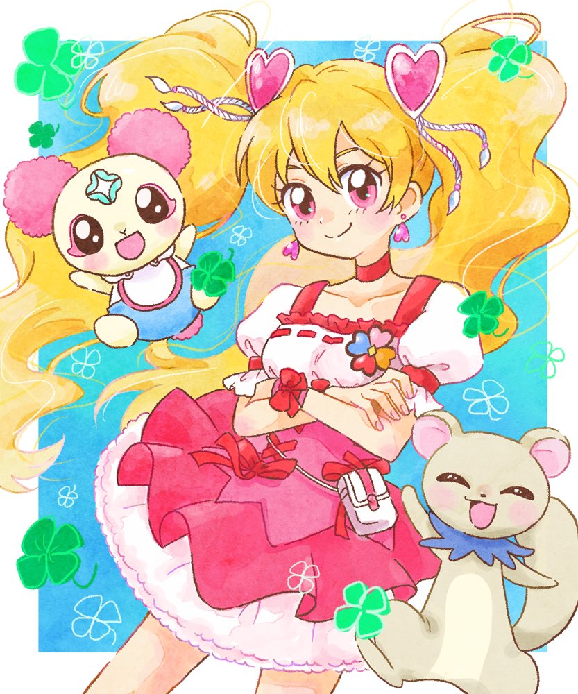 1girl blonde_hair bow chiffon_(precure) choker clover commentary_request crossed_arms cure_peach earrings four-leaf_clover fresh_precure! hair_ornament heart heart_hair_ornament hoppetoonaka3 jewelry long_hair looking_at_viewer magical_girl momozono_love pink_eyes precure simple_background skirt smile tart_(precure) twintails