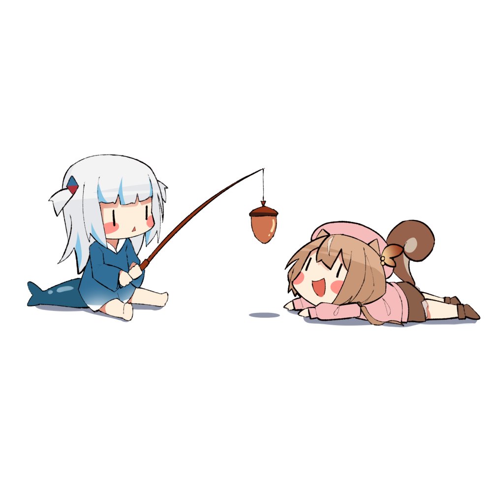 2girls acorn animal_ears ayunda_risu ayunda_risu_(1st_costume) barefoot beret blue_hair blue_hoodie blunt_bangs blush_stickers boots brown_footwear brown_hair brown_skirt cardigan chibi commentary english_commentary fins fish_tail fishing_rod fold-over_boots fur-trimmed_boots fur_trim gawr_gura gawr_gura_(1st_costume) grey_hair hair_ornament hat holding holding_fishing_rod hololive hololive_english hololive_indonesia hood hoodie leaf_hair_ornament long_hair long_sleeves looking_at_another low_twintails lying multicolored_hair multiple_girls nonstop_nut_november on_stomach open_mouth pink_cardigan pink_headwear shark_girl shark_hair_ornament shark_tail simple_background sitting skirt squirrel_ears squirrel_girl squirrel_tail streaked_hair tail twintails two_side_up virtual_youtuber white_background yuyu5x