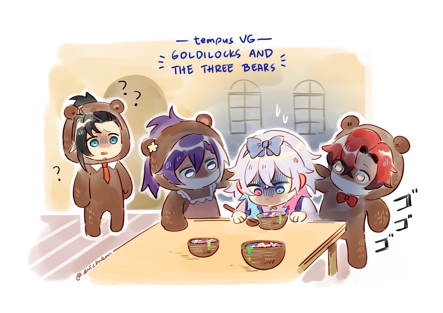 ? animal_costume animal_hood apron artist_name banzoin_hakka bear_costume bear_hood beard_stubble black_hair blue_eyes blue_hair bow braid coll_(erichankun) crossed_bangs ear_flower english_text facial_hair french_braid gavis_bettel goldilocks_and_the_three_bears gradient_hair hair_between_eyes hair_bow hand_on_another's_head heterochromia holding holding_spoon holostars holostars_english hood josuiji_shinri looking_at_another machina_x_flayon menacing_(jojo) multicolored_hair multiple_boys necktie nervous nervous_sweating orange_necktie pink_eyes pink_hair porridge purple_eyes purple_hair red_bow red_hair shaded_face spoon stubble sweat sweatdrop virtual_youtuber white_hair window