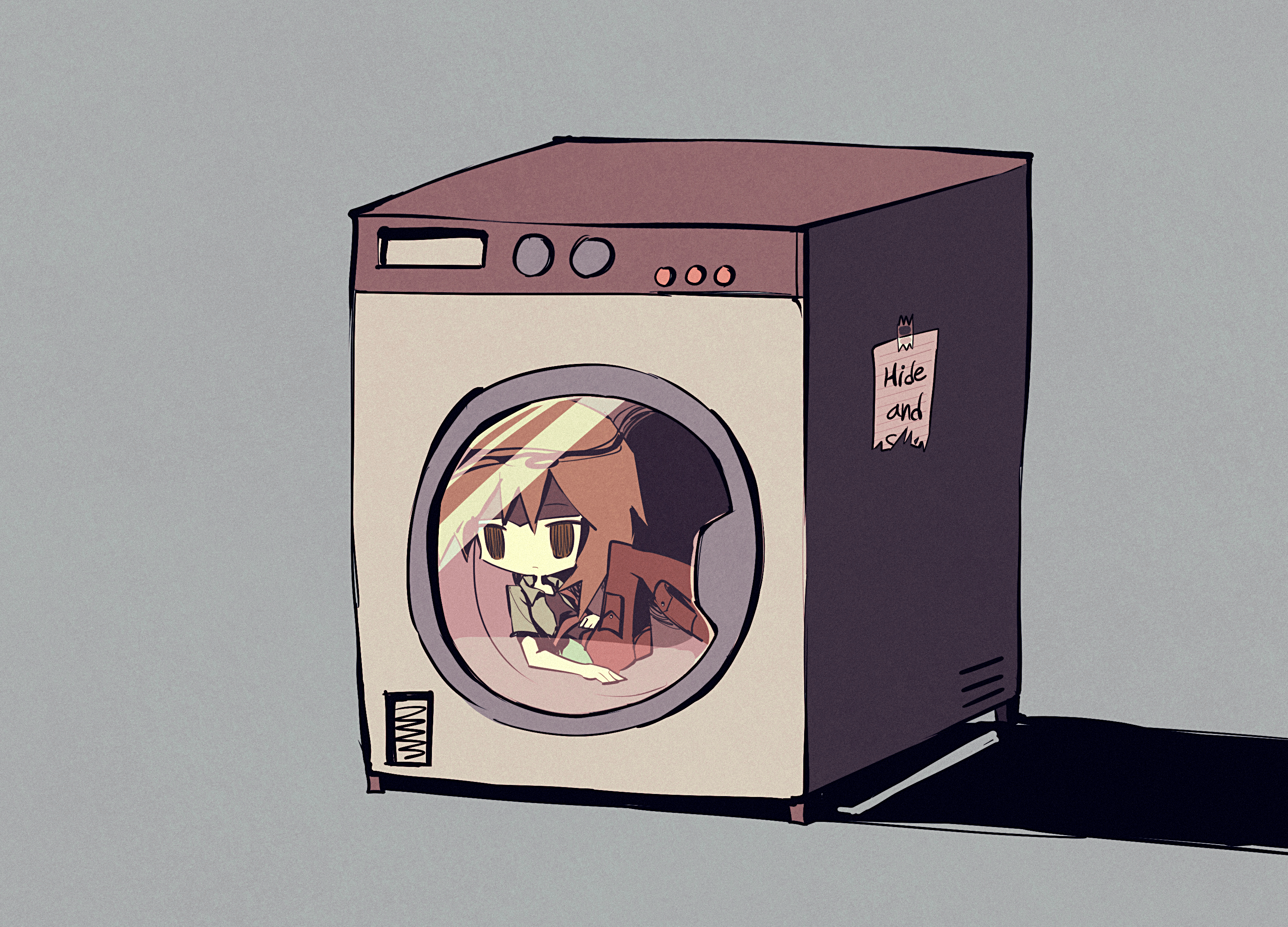 1other androgynous atoymk black_headband black_shirt brown_eyes brown_hair cargo_pants closed_mouth collared_shirt english_text film_grain grey_background grey_shirt headband highres kurohebi len'en no_nose open_clothes open_shirt other_focus pants red_pants shirt short_sleeves simple_background solo washing_machine