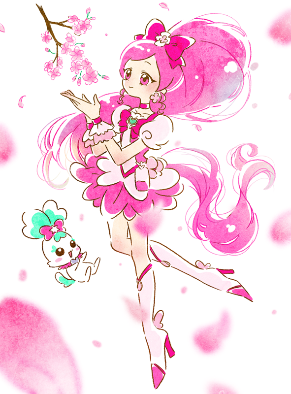 1girl blush boots bow brooch cherry_blossoms choker chypre_(precure) commentary_request cure_blossom hair_bow hair_ornament hanasaki_tsubomi heart heart_brooch heartcatch_precure! high_ponytail hoppetoonaka3 jewelry long_hair magical_girl pink_bow pink_choker pink_eyes pink_hair pink_theme ponytail precure ribbon simple_background skirt smile white_background