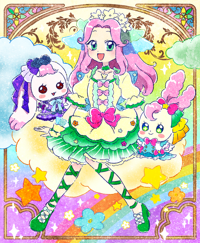 1girl bow brooch bubble_skirt butterfly_brooch choker commentary_request cure_felice flower green_choker green_eyes green_footwear green_ribbon hair_flower hair_ornament hanami_kotoha hoppetoonaka3 in-franchise_crossover jewelry kirakira_precure_a_la_mode kirarin_(precure) leg_ribbon long_hair looking_at_viewer magical_girl mahou_girls_precure! milk_(precure) open_mouth pink_hair precure ribbon skirt smile yes!_precure_5