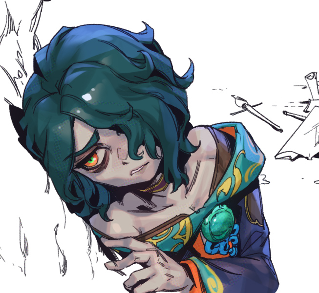 1boy bags_under_eyes collarbone green_hair hair_over_one_eye hwei_(league_of_legends) league_of_legends long_sleeves male_focus medium_hair orange_eyes parted_lips phantom_cross short_hair solo teeth upper_body white_background