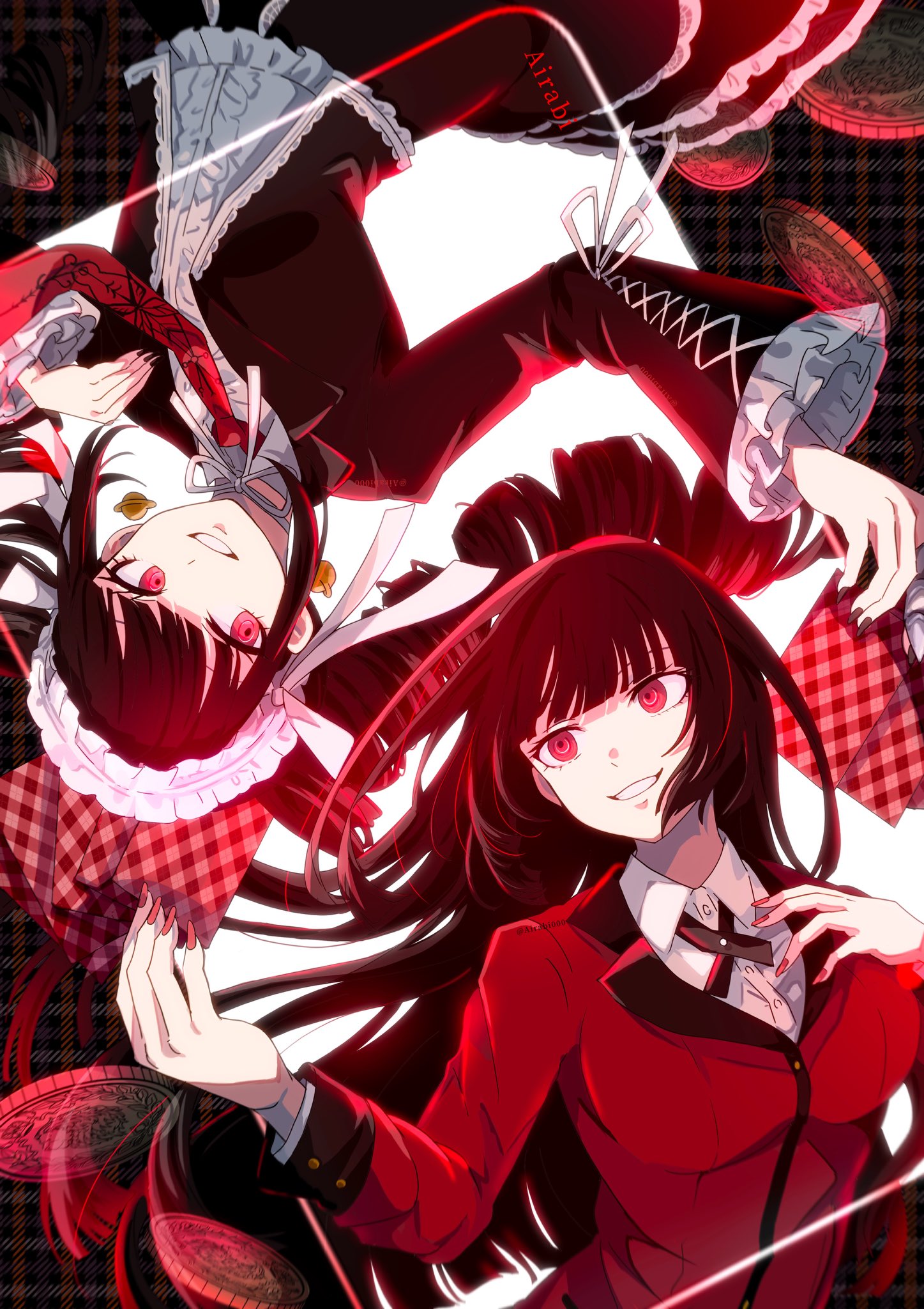 2girls airabi artist_name black_dress black_hair black_nails breasts card celestia_ludenberg coin danganronpa:_trigger_happy_havoc danganronpa_(series) dress dress_shirt drill_hair earrings frilled_dress frills gothic_lolita hand_on_own_chest headdress highres holding holding_card hyakkaou_academy_school_uniform jabami_yumeko jacket jewelry kakegurui large_breasts lolita_fashion long_hair looking_at_another money multiple_girls nail_polish necktie plaid_background playing_card red_eyes red_jacket red_nails red_necktie school_uniform shirt teeth twin_drills upside-down white_shirt