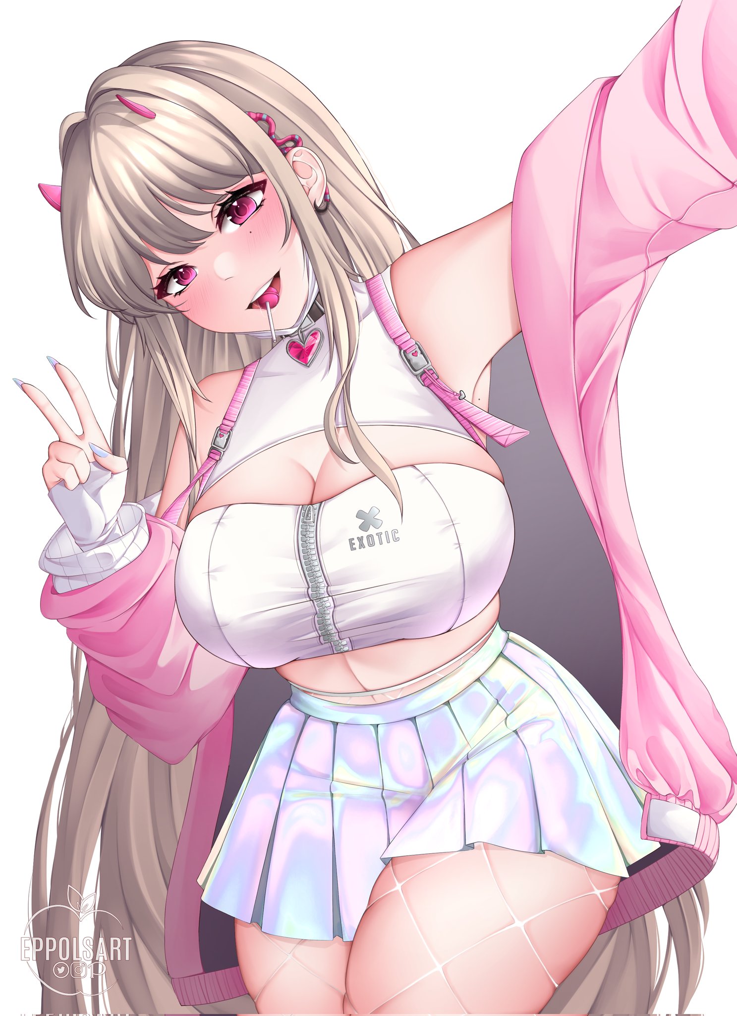 1girl armpits bare_shoulders black_choker blush breasts candy choker eppols_art fingernails fishnet_thighhighs fishnets food gloves goddess_of_victory:_nikke hair_over_breasts heart heart_choker highres iridescent_clothes horns large_breasts lollipop mole mole_under_eye nail_polish pink_eyes pink_sweater pleated_skirt seductive_smile selfie shirt skirt smile sweater thighhighs viper_(nikke) white_shirt