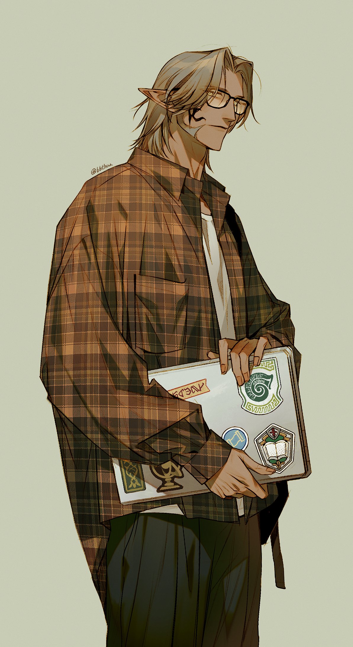 1boy alternate_costume bbthou bespectacled black-framed_eyewear black_pants brown_hair brown_shirt collared_shirt commentary_request computer contemporary cowboy_shot elezen elf expressionless eyes_visible_through_hair facial_tattoo final_fantasy final_fantasy_xiv flannel from_side glasses highres holding holding_laptop korean_commentary laptop long_sleeves looking_at_viewer male_focus medium_hair pants pointy_ears shirt sideburns signature simple_background solo standing sticker tattoo twitter_username unmoving_pattern urianger_augurelt white_shirt yellow_background yellow_eyes