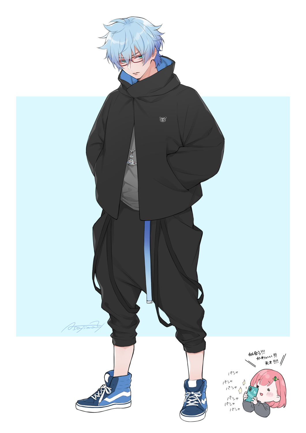 1boy 1girl aqua_background aqua_eyes asajimags black_jacket black_pants blue_footwear blue_hair blush bob_cut casual chibi closed_mouth full_body glasses grey_shirt hair_between_eyes hands_in_pockets hands_up happy high_collar highres himuro_inori holding holding_phone jacket jewelry long_sleeves looking_at_viewer necklace outside_border pants pendant phone pink_hair protagonist_(tokimemo_gs4) puffy_pants red-framed_eyewear shirt shoes short_hair sneakers solo_focus standing suspenders_hanging taking_picture tokimeki_memorial tokimeki_memorial_girl's_side tokimeki_memorial_girl's_side_4th_heart two-sided_fabric two-sided_jacket