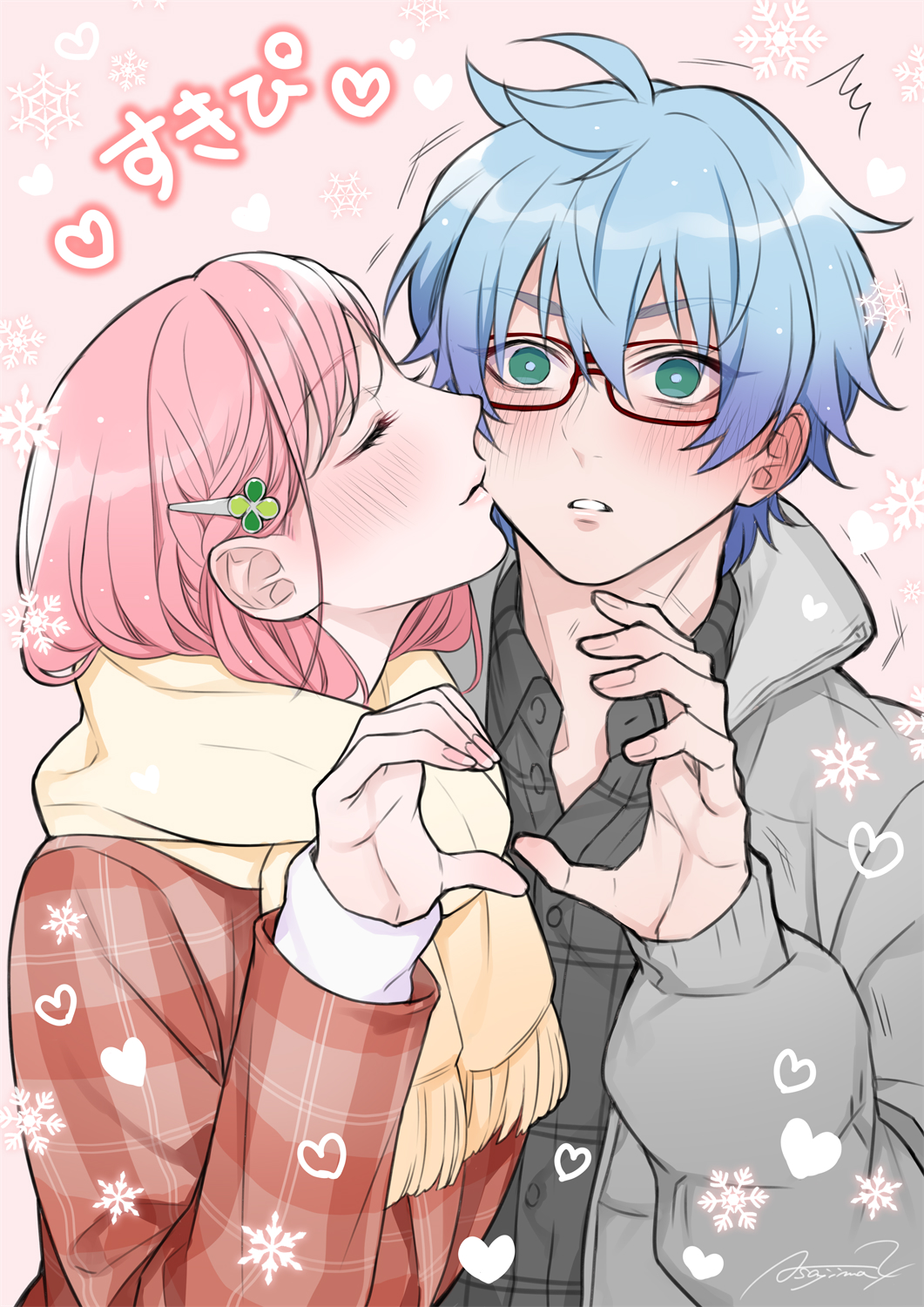 1boy 1girl aqua_eyes asajimags blue_hair blush braid casual clover collared_shirt dress_shirt ear_blush enpera facing_another four-leaf_clover glasses grey_jacket grey_shirt hair_ornament hairclip hand_up heart heart_hands_failure hetero highres himuro_inori jacket kiss kissing_cheek looking_at_viewer pink_background pink_hair pink_nails plaid_clothes plaid_jacket profile protagonist_(tokimemo_gs4) scarf shirt short_hair side_braid signature single_braid snowflakes surprised tokimeki_memorial tokimeki_memorial_girl's_side tokimeki_memorial_girl's_side_4th_heart upper_body wide-eyed winter_clothes yellow_scarf