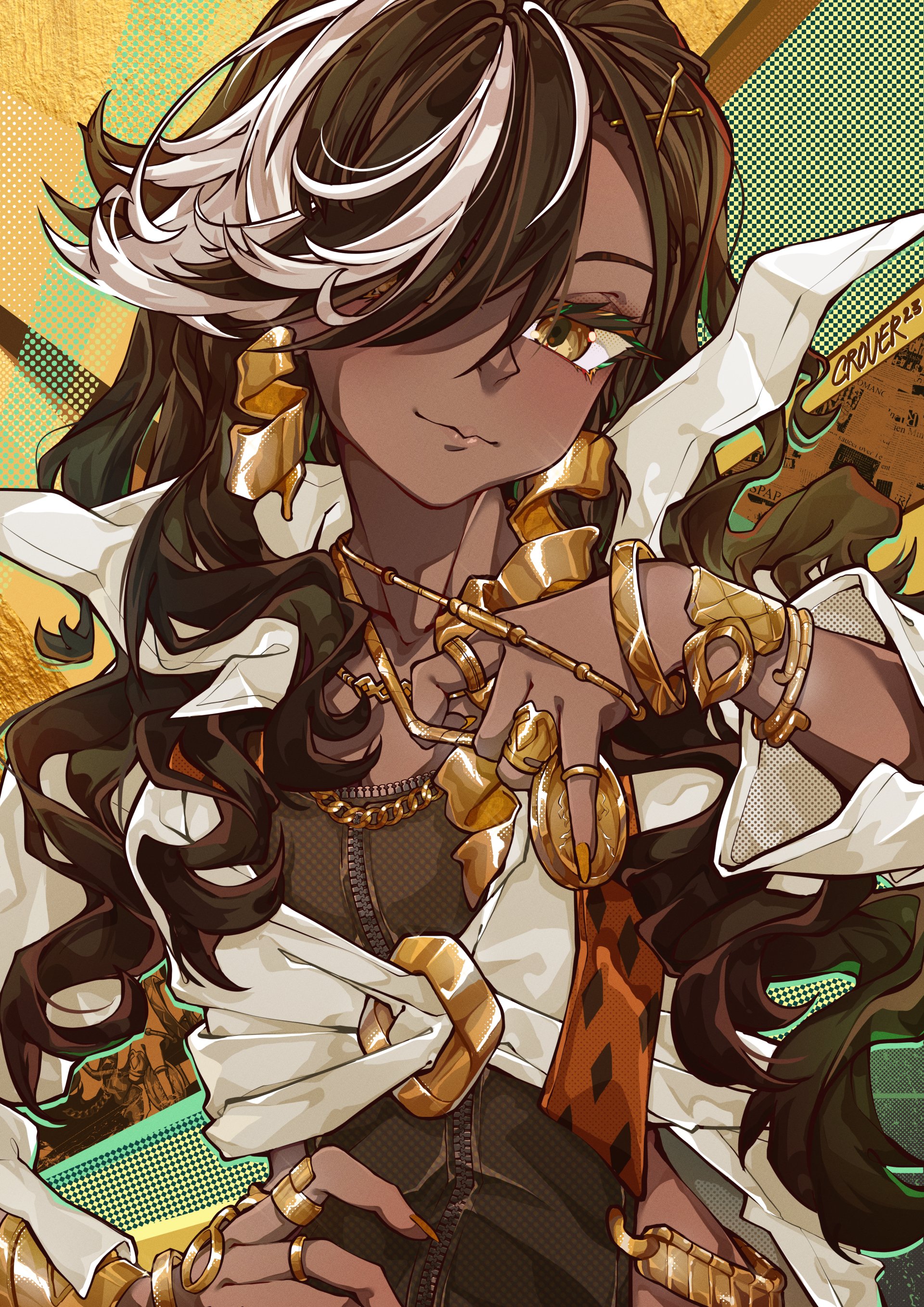 1girl absurdres black_dress black_hair bracelet brown_eyes centurion_(reverse:1999) closed_mouth commentary crover dark-skinned_female dark_skin dress fingernails hand_on_own_hip highres jacket jewelry long_fingernails long_hair long_sleeves looking_at_viewer multicolored_hair multiple_rings necklace orange_nails reverse:1999 ring smile solo streaked_hair white_hair white_jacket zipper