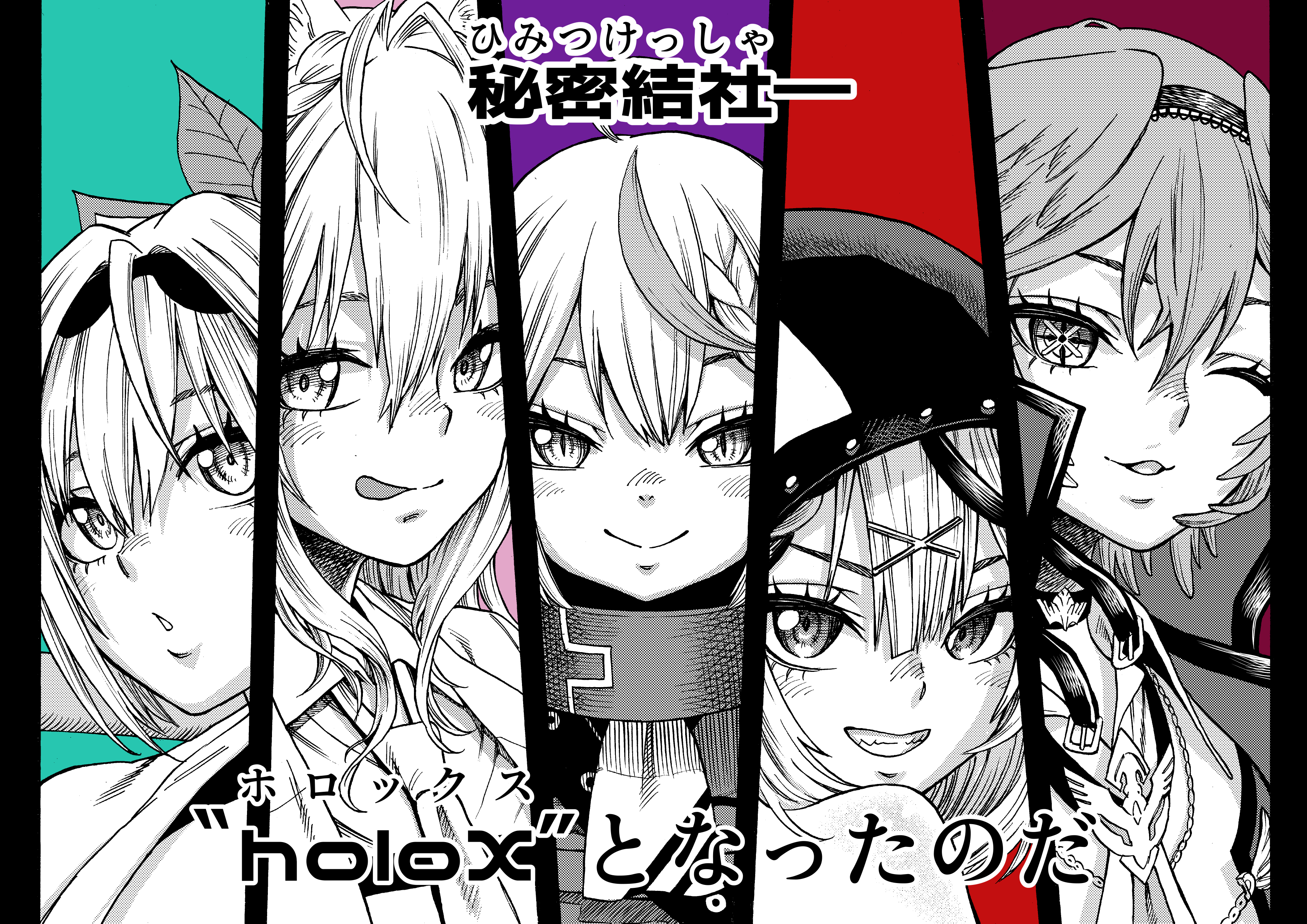 5girls absurdres ahoge animal_ears animal_hood antenna_hair collar commentary_request cross-shaped_pupils crosshair_pupils greyscale greyscale_with_colored_background grin hair_ornament hairband hakui_koyori head_wings highres hololive holox hood kazama_iroha la+_darknesss lineup monochrome multicolored_hair multiple_girls necktie one_eye_closed orca_hood sakamata_chloe smile symbol-shaped_pupils takane_lui takayama_akira tongue tongue_out translation_request two-tone_hair virtual_youtuber wings wolf_ears wolf_girl x_hair_ornament